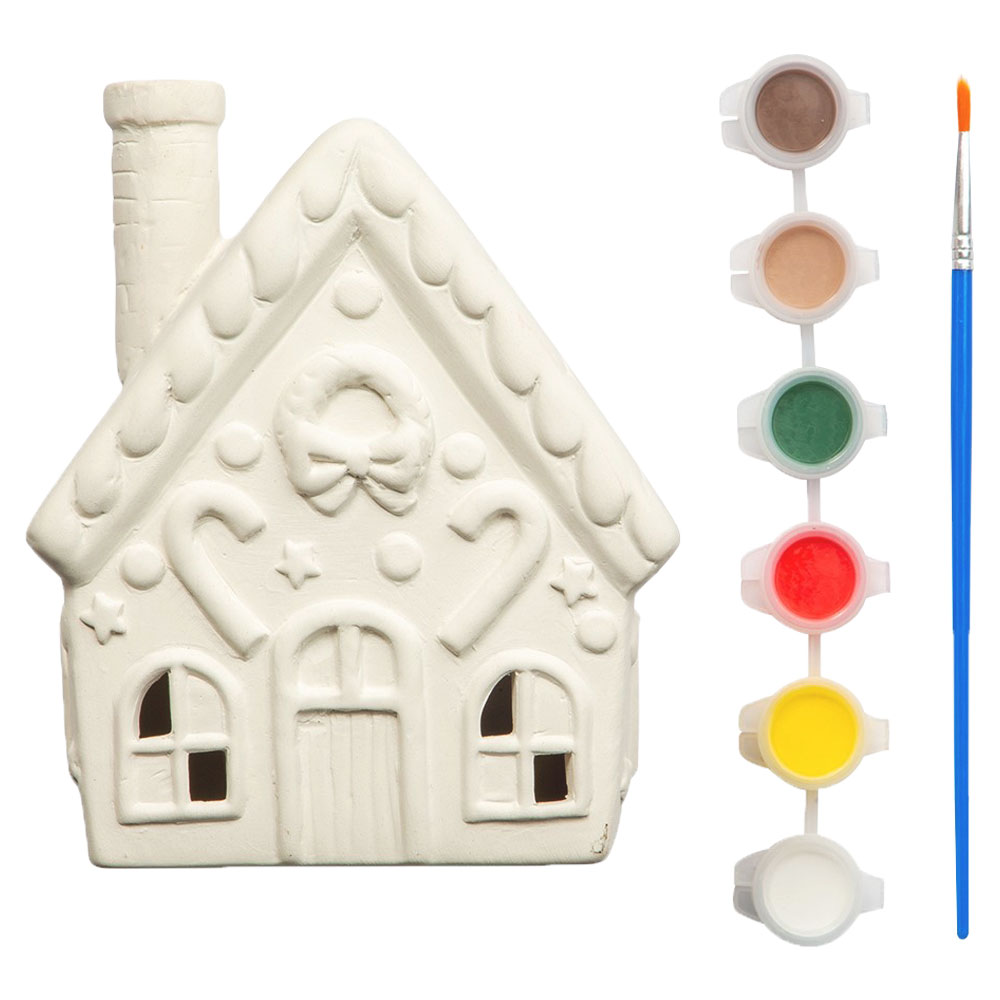Måla Ditt Eget Julhus Ljuslykta Set omfattar ett kit bestående av en ljuslykta för värmeljus i form av ett keramikhus med juliga detaljer, sex burkar målarfärg i gult, rött, grönt, vitt, ljusbrunt och mörkbrunt samt en smal målarpensel.