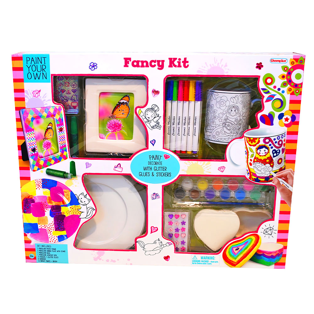 Målar Set Fancy omfattar ett stort måleripyssel set för barn över 3+ år. Settet innehåller en fotoram, en mattallrik med hållare, en kopp och en smyckesask av porslin. Medföljer även målarfärger, målarpenslar, färgpennor, glitterlim och stickers.