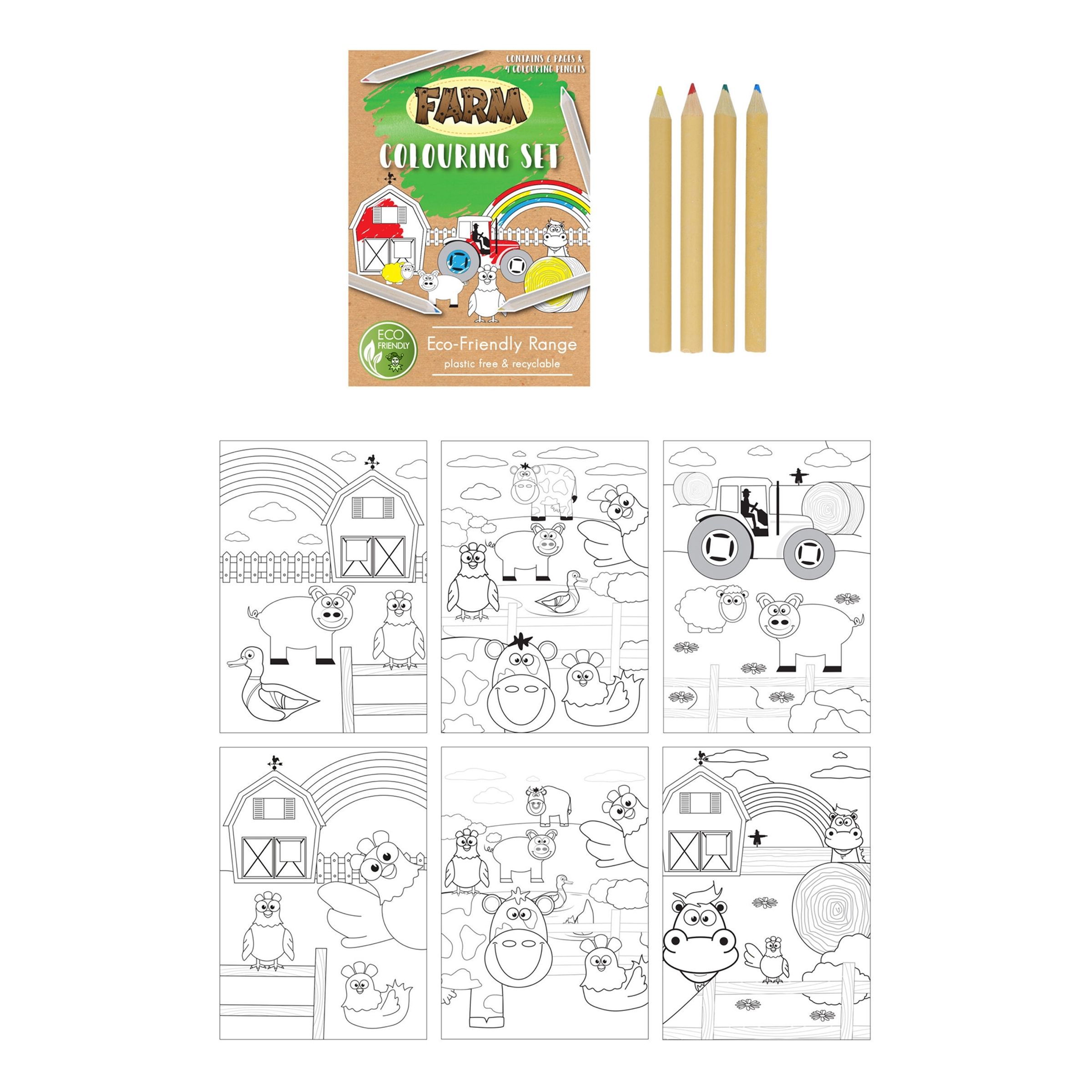 Målarbok Mini Bondgård är en miljövänlig målarbok innehållandes 6 ark med olika motiv samt 4 minifärgpennor i färgerna gult, rött, grönt och blått.
