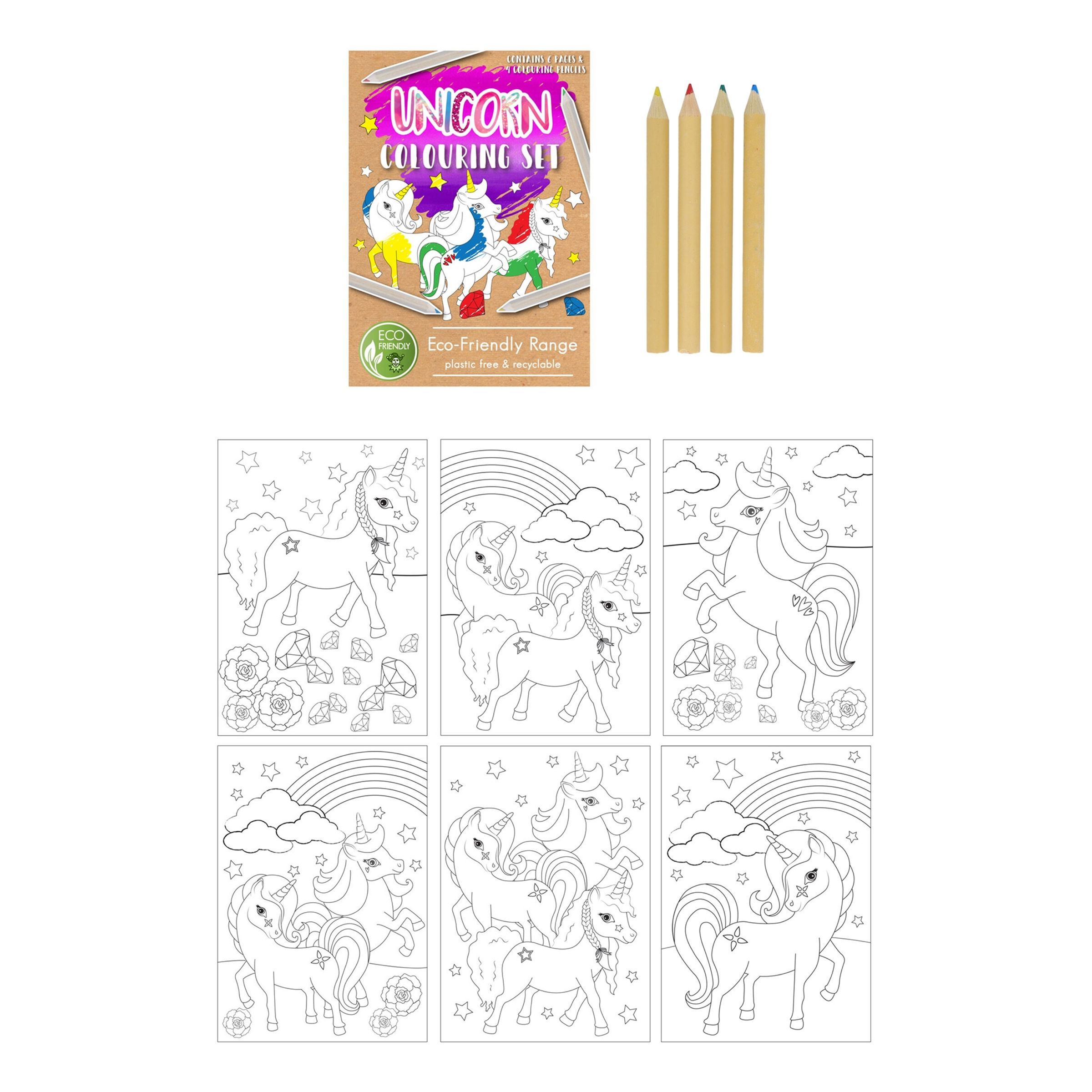Målarbok Mini Enhörning är en miljövänlig målarbok innehållandes 6 ark med olika motiv samt 4 minifärgpennor i färgerna gult, rött, grönt och blått.