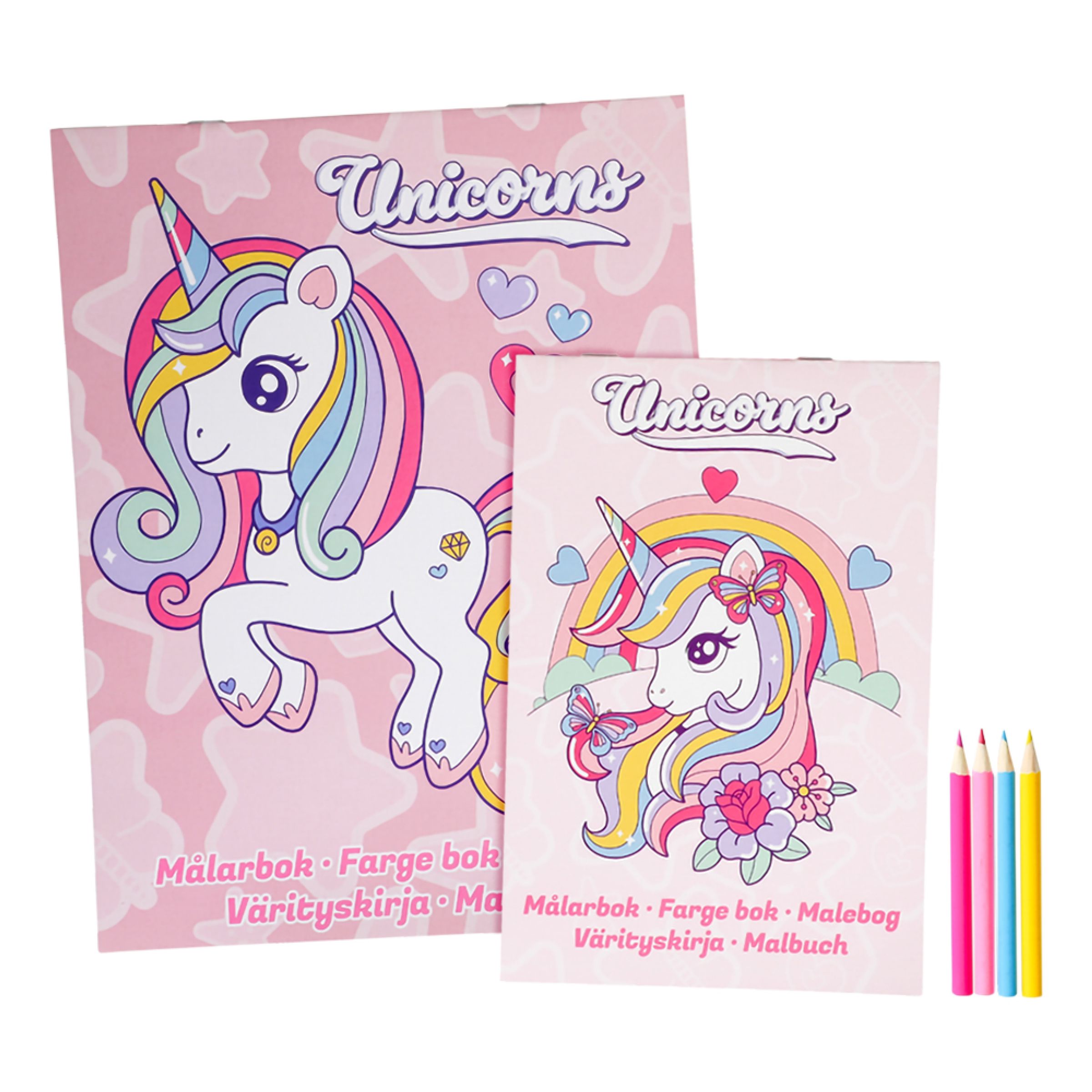 Målarbok Set Unicorns inkluderar två stycken målarböcker fyllda med enhörningsmotiv och fyra stycken färgpennor (rosa, gul, blå, ljusrosa). Perfekt som present till det pyssliga barnet som drömmer om magiska regnbågar!