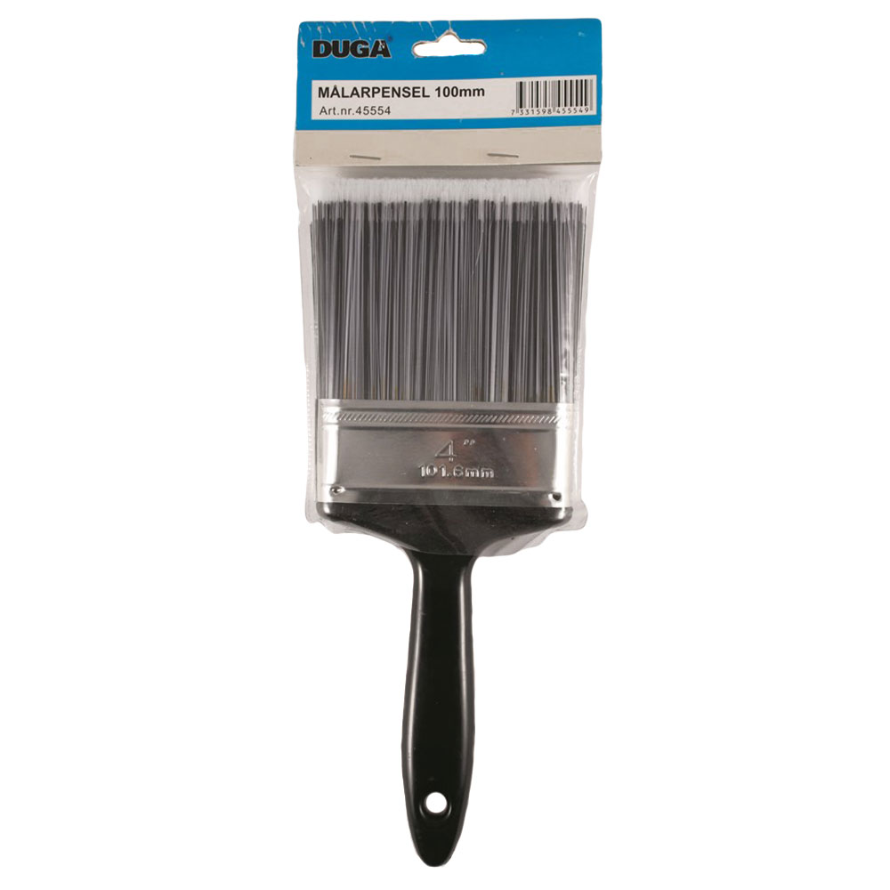 Målarpensel 100 mm omfattar en bred målarpensel med syntetborst. Penseln är 4 tum bred, dvs ca 10 cm.