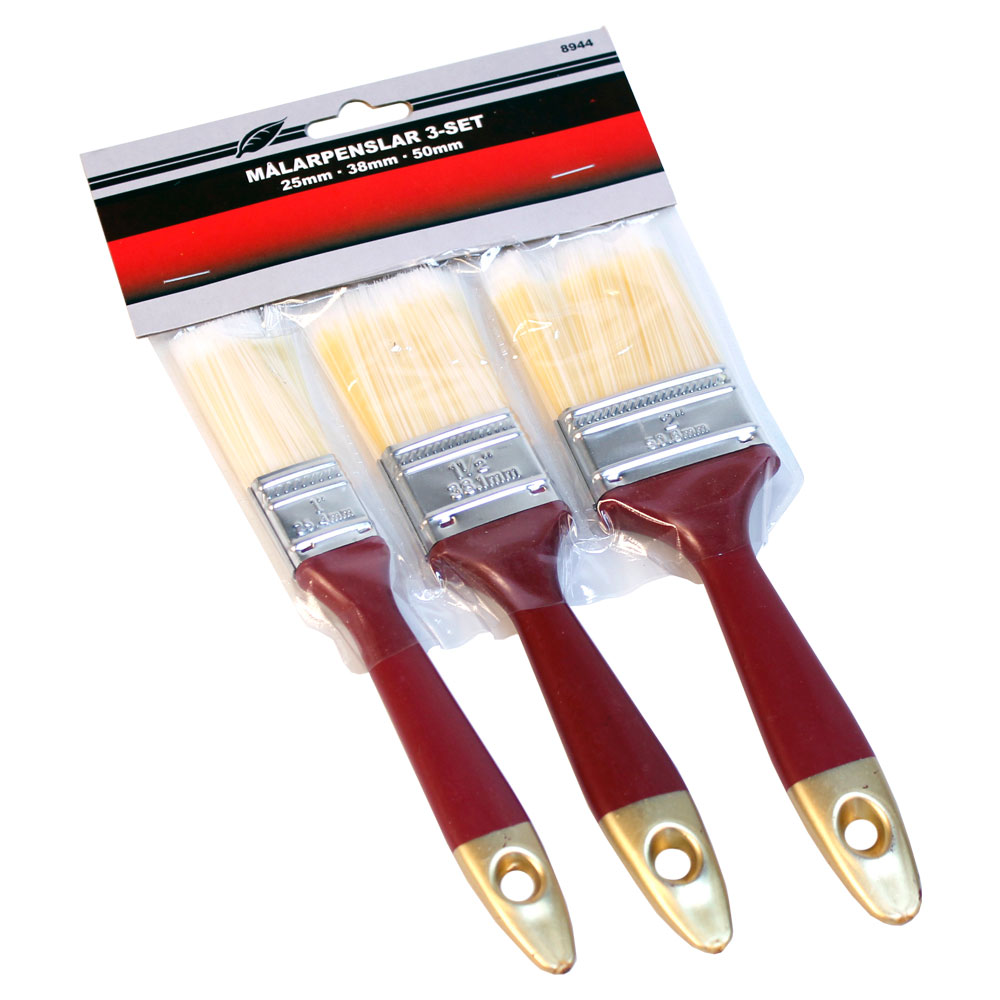 Penselset omfattar ett set med tre olika målarpenslar av plast och polyester. Penslarna är 25,4 mm, 33,1 mm och 50,8 mm breda.