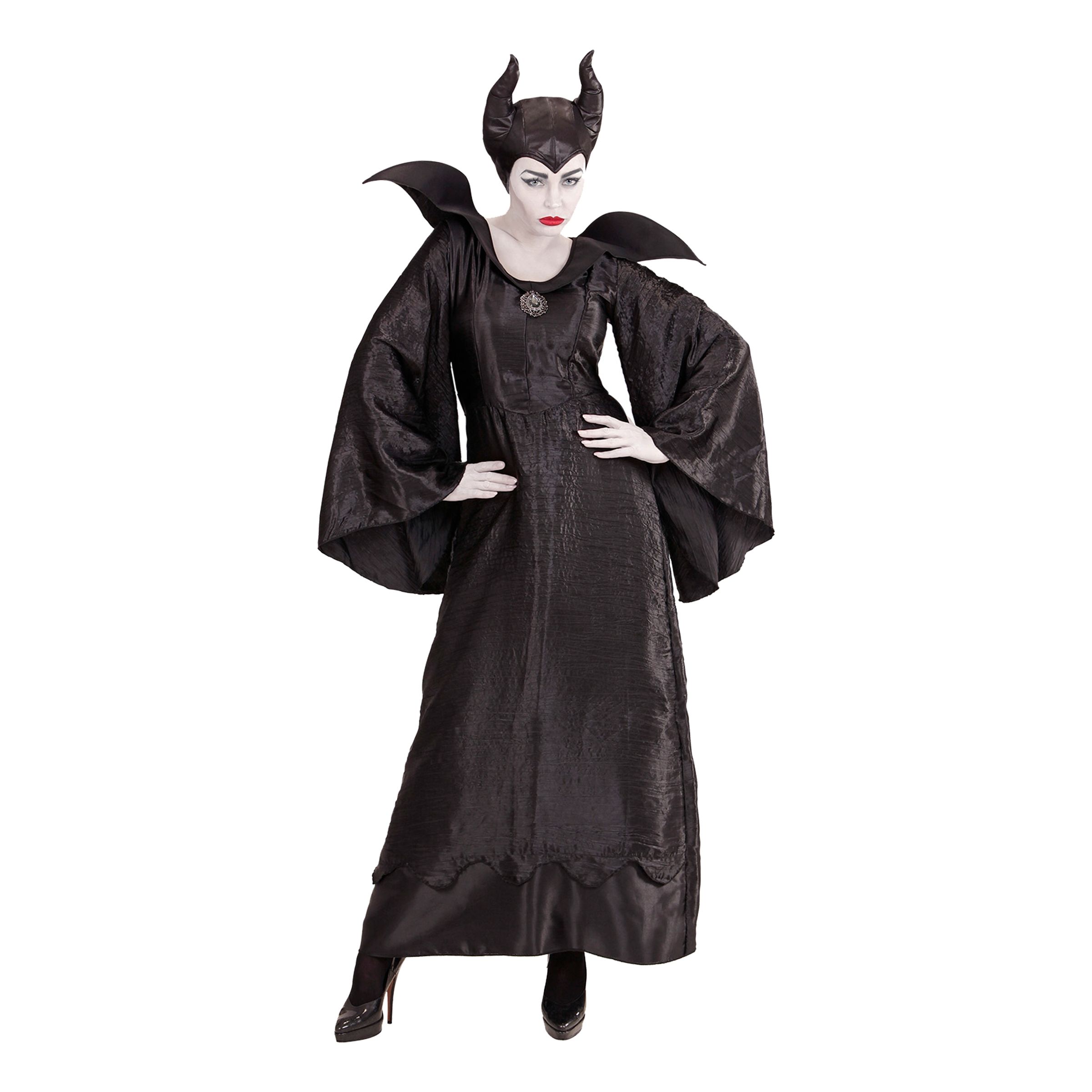 Maleficient Dam Maskeraddräkt finns i storleken Small, Medium och Large. Dräkten är tillverkad av polyester och innehåller klänning och huvudbonad. Årets elakaste dräkt? Mycket möjligt!