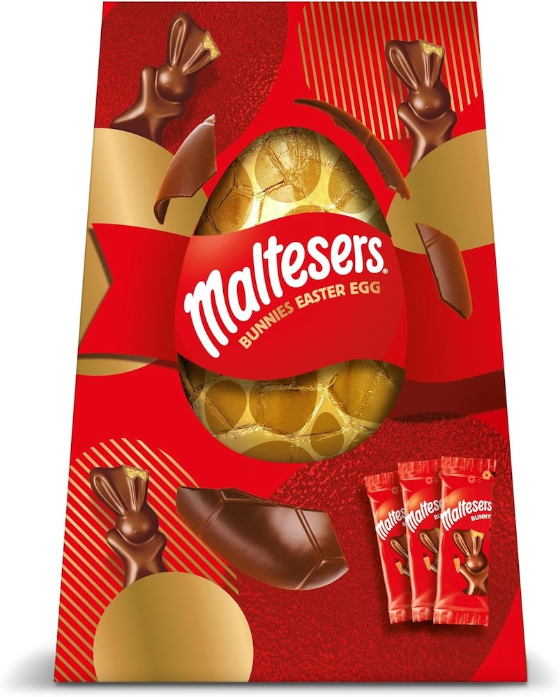 Fira påsken med Maltesers Bunnies påskägg – ett extra stort mjölkchokladägg tillsammans med tre söta Maltesers Bunny-chokladkakor. Varje kanin-formad chokladkaka är fylld med maltkräm och knapriga honeycomb-bitar. Den perfekta kombinationen av krispig och len choklad för påskfirandet.