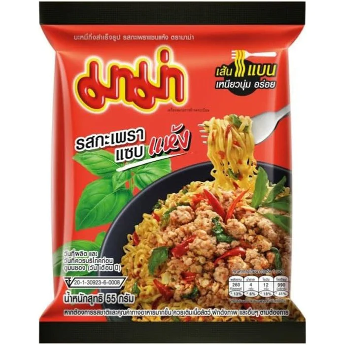 Mama snabbnudlar med smak av den thailändska rätten Pad Krapow, med wokad basilika som huvudingrediens.