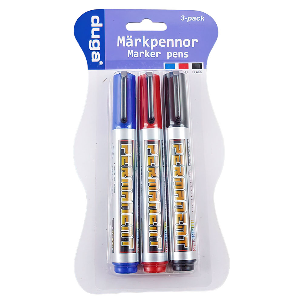 En permanent marker märk-penna av plast är alltid bra att ha, i detta 3-pack märkpennor får du dessutom tre olika färger som röd, blå och svart. Dessa märkpennor kan användas på många olika material, de är hållbara och torkar snabbt.