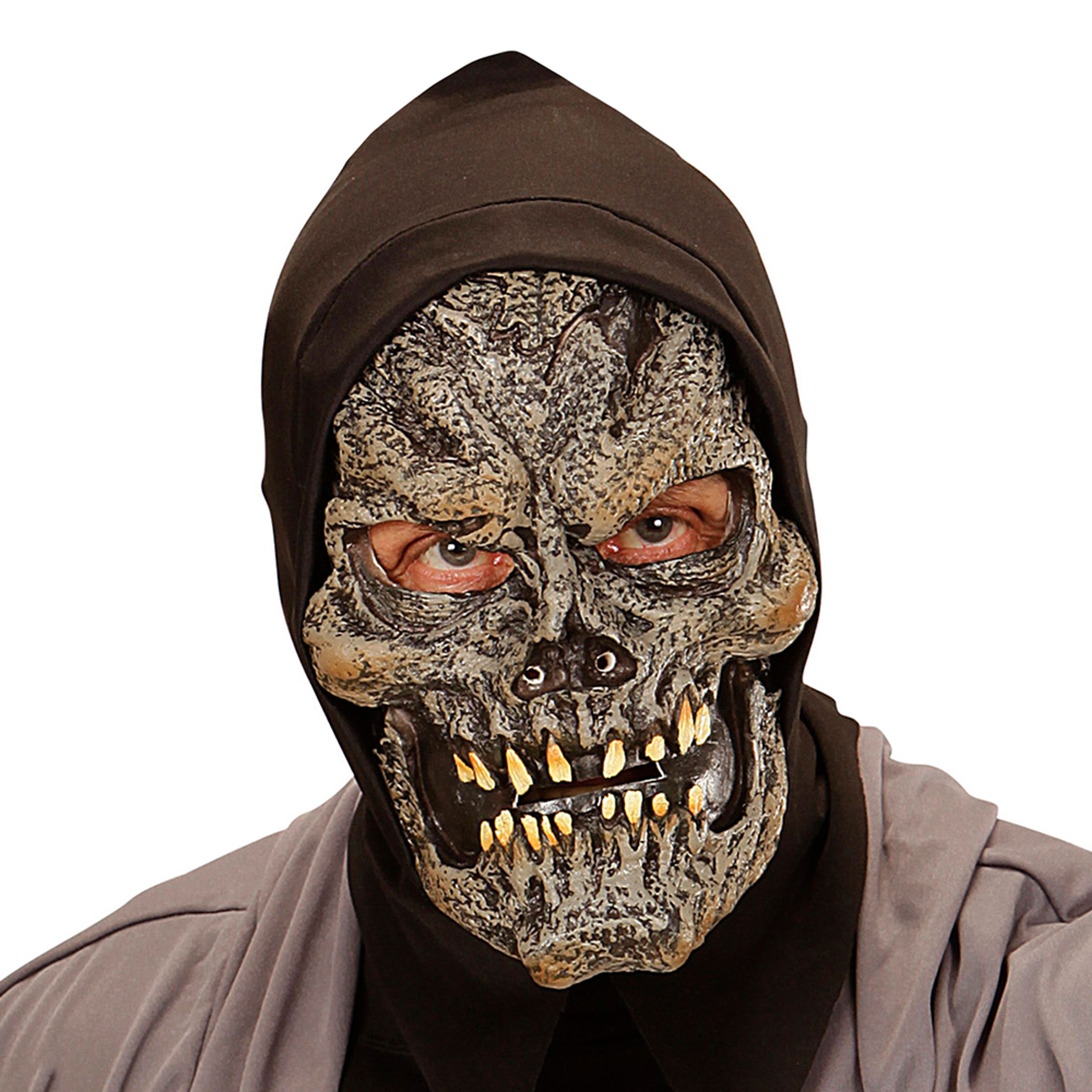 Mask Grim Reaper består av en grå skelettmask av plast som kommer med en svart huva som tänker hela huvudet och halsen. Masken är lätt och bekväm att se och andas ur.