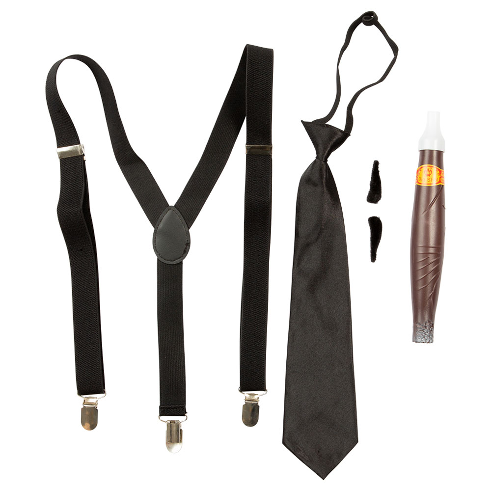 – Maskeradtillbehör med hängslen, slips, mustach och cigarr.