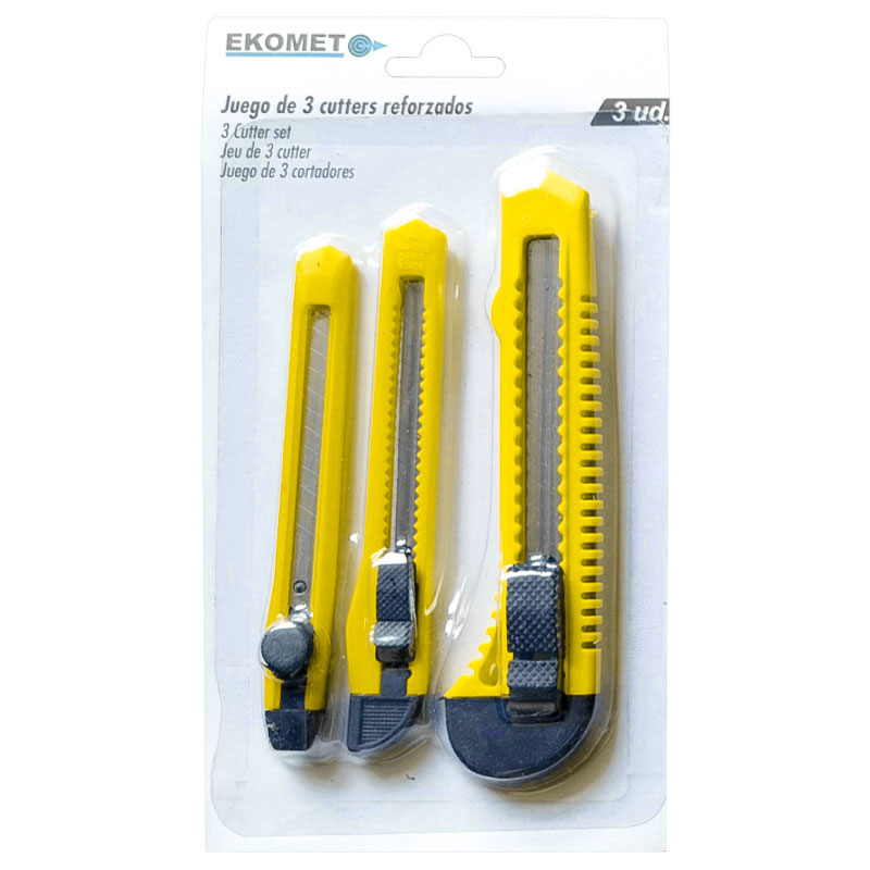 Praktiska mattknivar till dig som vill fixa och dona hemma. Detta pack innehåller tre brytbladsknivar i olika storlekar, perfekt att använda till diverse ändamål. Dessa kartongknivar passar både till byggprojekt och pysselstund, ett utmärkt set skärknivar helt enkelt.
