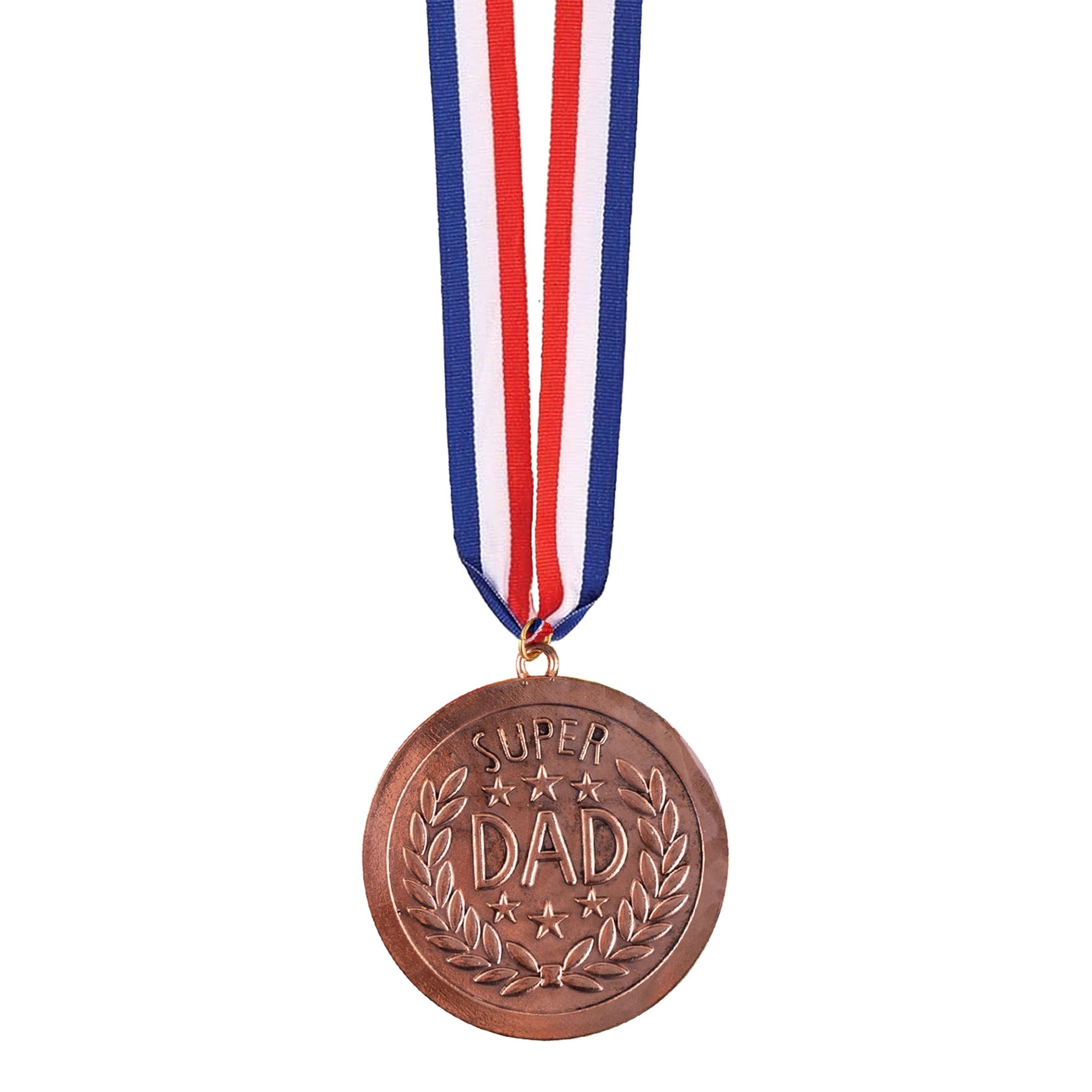 Medalj Super Dad är en bronsfärgad medalj som kommer med texten "Super Dad" ingraverat. Medaljen kommer dessutom med en snyggt band i färgerna röd, vit och blå att hänga runt halsen.