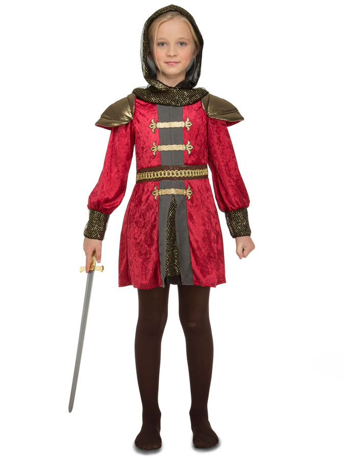 Medeltida Krigare Maskeraddräkt Barn består av en detaljrik rock med huva i rött, brunt och guld.