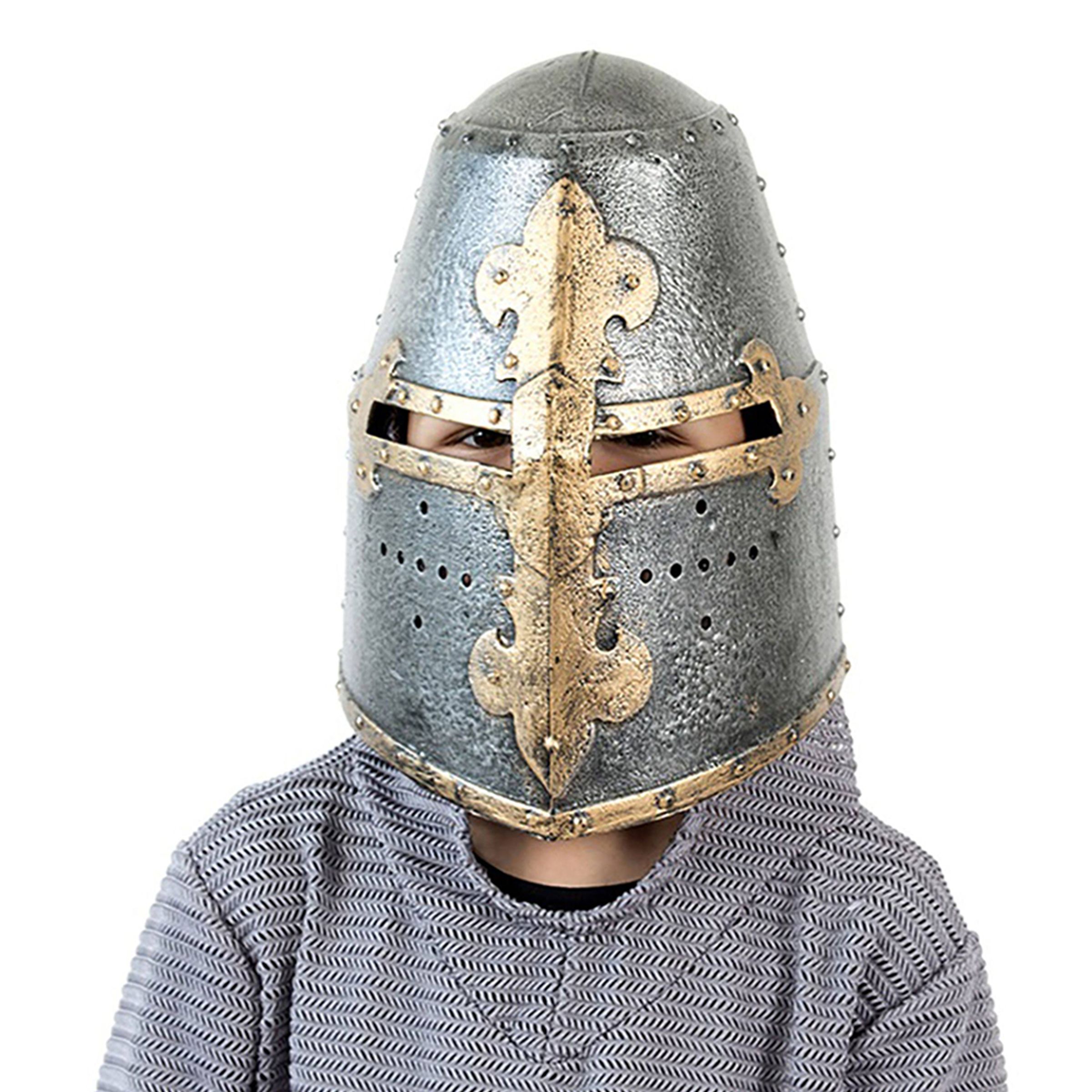 Medeltida Tornerhjälm Barn är en silverfärgad hjälm med guldfärgade detaljer. Hjälmen är heltäckande, den täcker alltså hela huvudet. På framsidan finns springor för ögonen. Hjälmen finns i en storlek som passar barn.