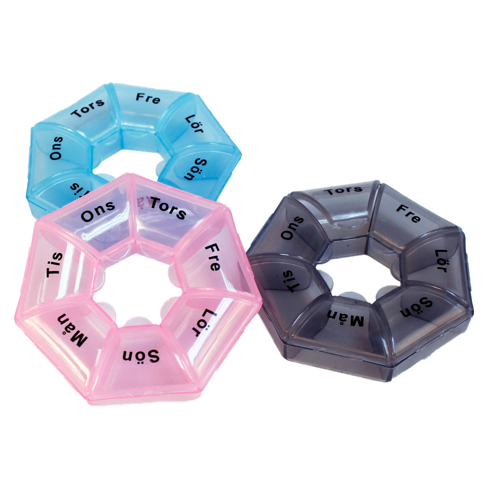 Medicindosett 7 Dagar omfattar en rund tablettdoserare med sju fack som är markerade med veckans dagar. Dosetten är tillverkad av plast och är ca 8,5 cm stor. Finns i färgerna rosa, blå och grå, vilken färg du får slumpas.