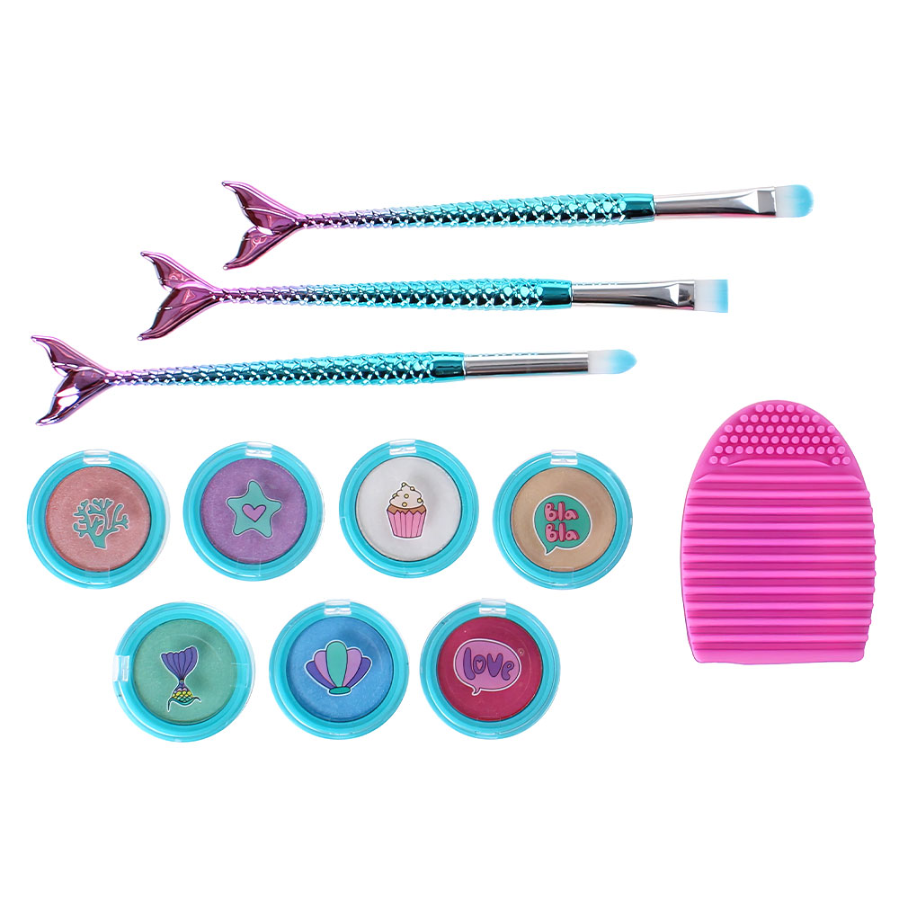 Mermaid Ögonskuggor och Sminkborstar omfattar ett sminkset för barn med 7 olika ögonskuggor, tre sminkborstar i sjöjungfru-design samt ett borstrengöringsverktyg. Passar barn från 6 år och uppåt.