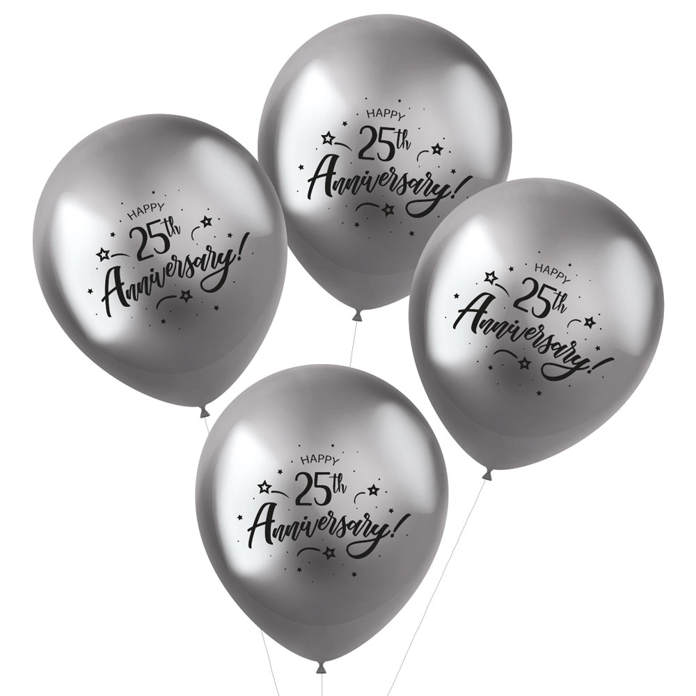Metal Shine Ballonger 25th Anniversary omfattar latexballonger i silver med metal shine finish och texten "Happy 25th Anniversary!" i svart snirklig stil med små detaljer runtom. Ballongerna fylls med luft eller helium, rymmer ca 15 liter och blir ca 33 cm stora. Säljs i 4-pack.