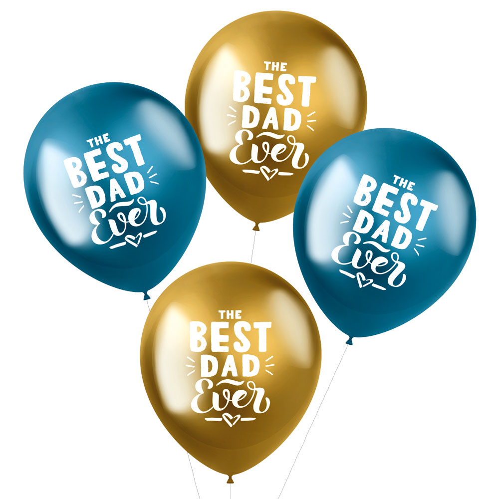 Fixa en härlig ballong dekoration till fars dag med festliga latexballonger i guld och blått med metal shine, glansiga och fina ballonger med "Best dad ever" text och motiv som garanterat blir en uppskattad gåva, superfina helium-ballonger som blir en snygg och rolig present med påminnelsen om att pappa är bäst.