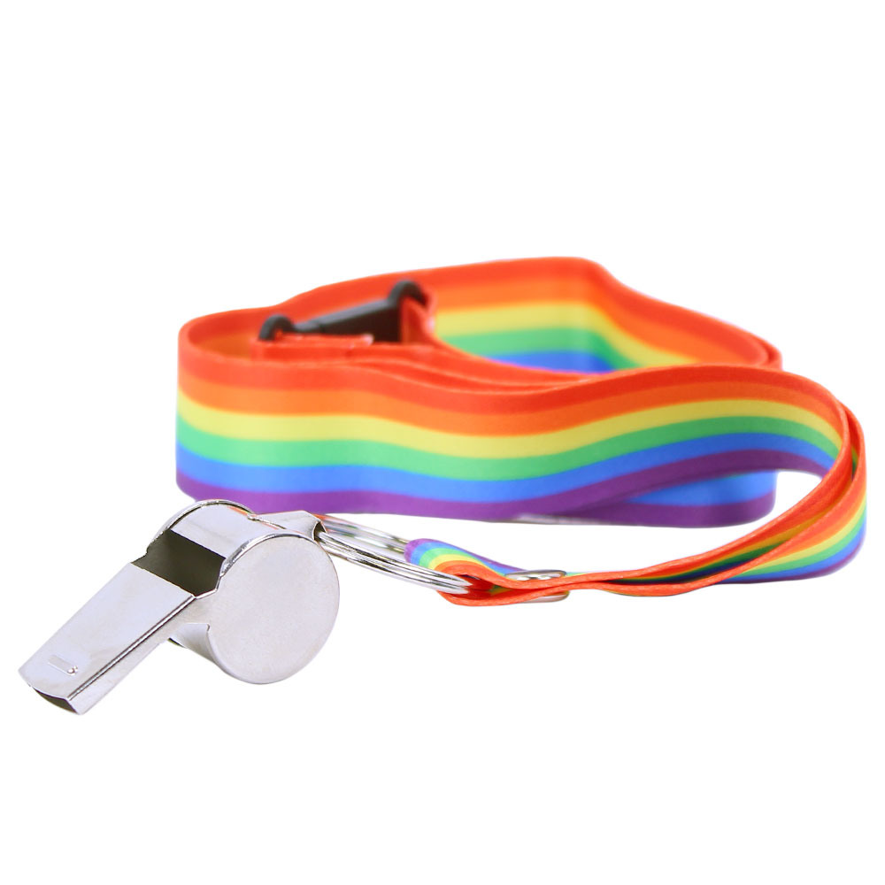 Metall Silver Visselpipa med Regnbåge Band består av en silverfärgad visselpipa i metall med långt band i regnbågsfärg att hänga runt halsen.