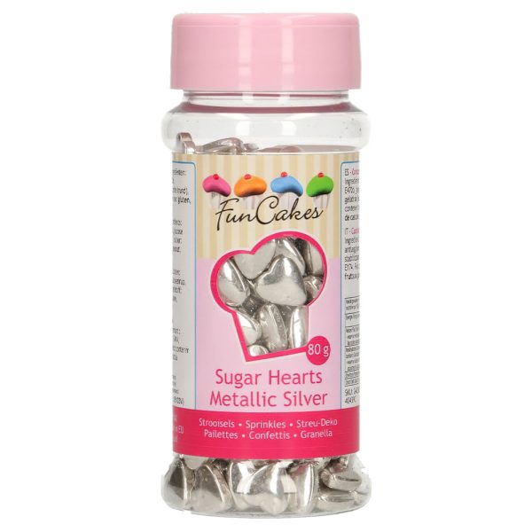 Metallic Silvrigt Hjärtströssel omfattar ett metallic silvrigt strössel i form av hjärtan.