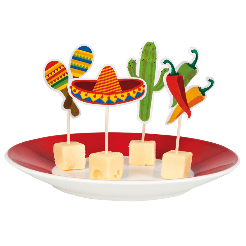 Mexico Fiesta Party Picks innehåller party picks med motiv av kaktusar, maracas, sombreros och chilifrukter.