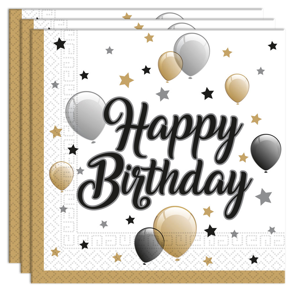 Milestone Happy Birthday Servetter omfattar vita servetter med svart "Happy Birthday" text och motiv av ballonger och stjärnor i silver, guld och svart samt guldig kant. Servetterna har två lager papper och är ca 33 x 33 cm. Säljs i 20-pack.