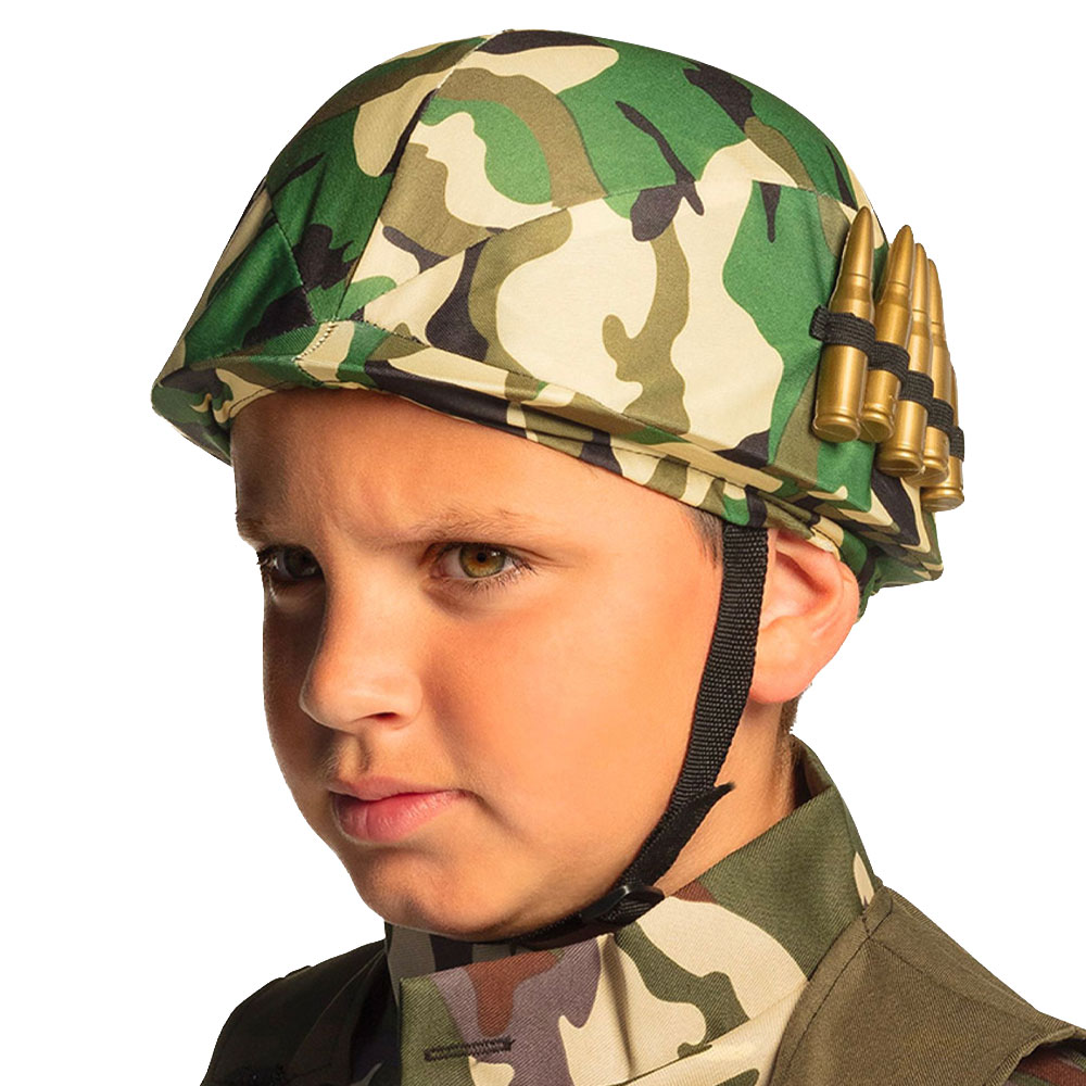 Militärhjälm Barn omfattar en hjälm med kamouflagemönster för barn. Militärhjälmen har fyra stycken plastpatroner på hjälmens ena sida som sitter fast med resårband. Hjälmen är i svart plast och överdraget i polyester och har en svart justerbar rem som håller hjälmen på plats. Passar barn.