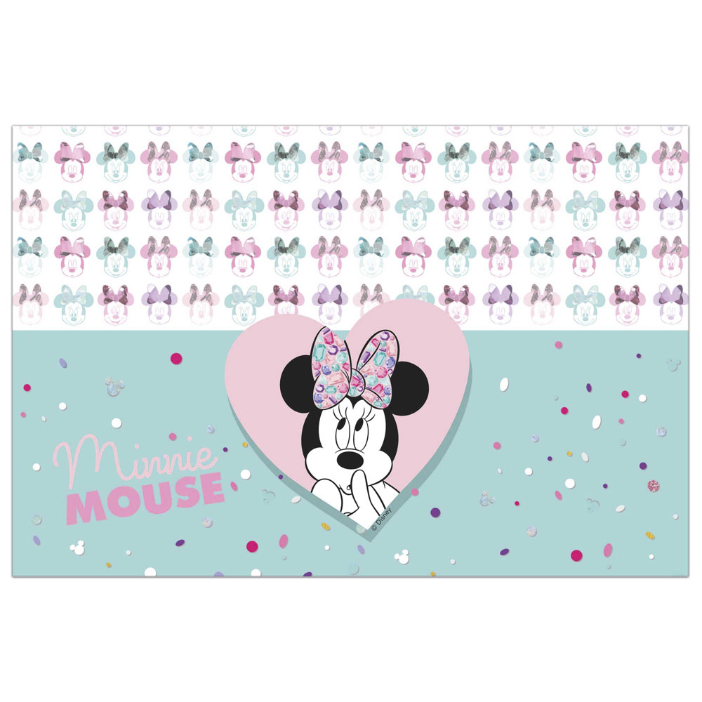 Mimmi Party Gem Plastduk består av en bordsduk i vitt och blått med fina motiv av små diamanter och Mimmi Pigg, samt texten "Minnie Mouse". Duken är tillverkad i plast.