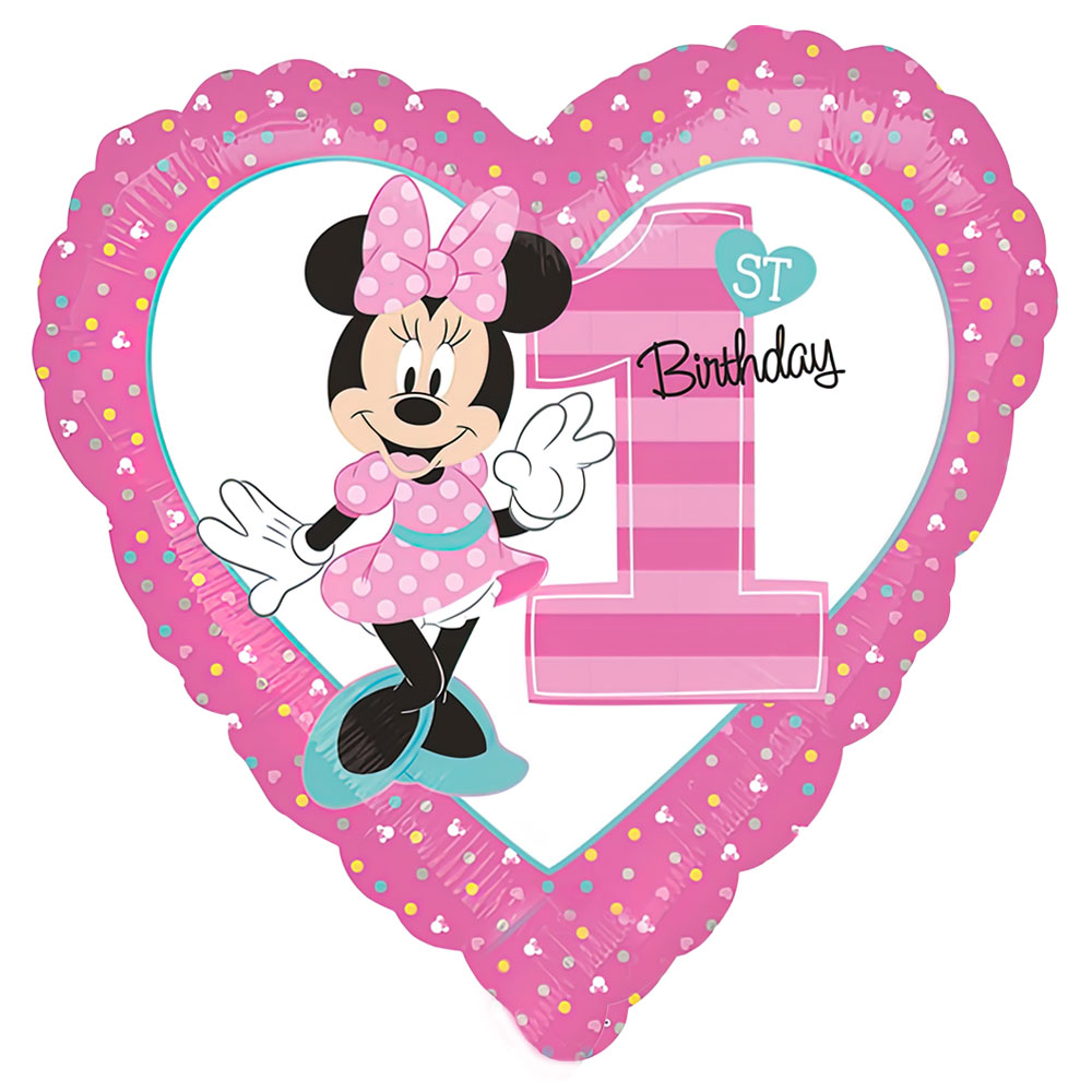 Mimmi Pigg 1 år Hjärtballong omfattar en ballong i folie i form av ett hjärta med motiv av Mimmi Pigg och text "1st Birthday". Ballongen fylls med luft eller helium.