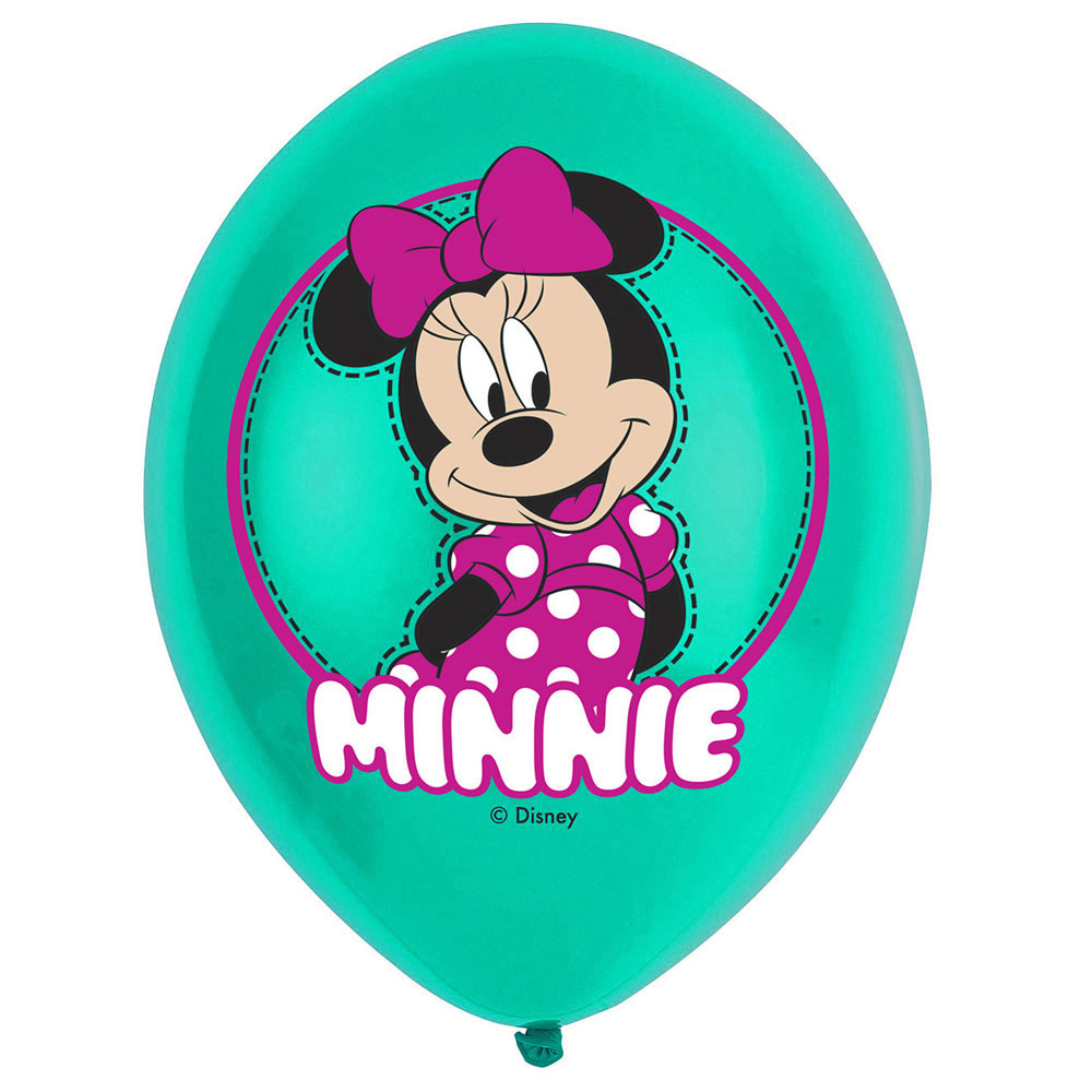 Mimmi Pigg Latexballonger innehåller 6 stycken mintgröna latexballonger med sött Mimmi Pigg motiv och texten "Minnie" i rosa och vitt.