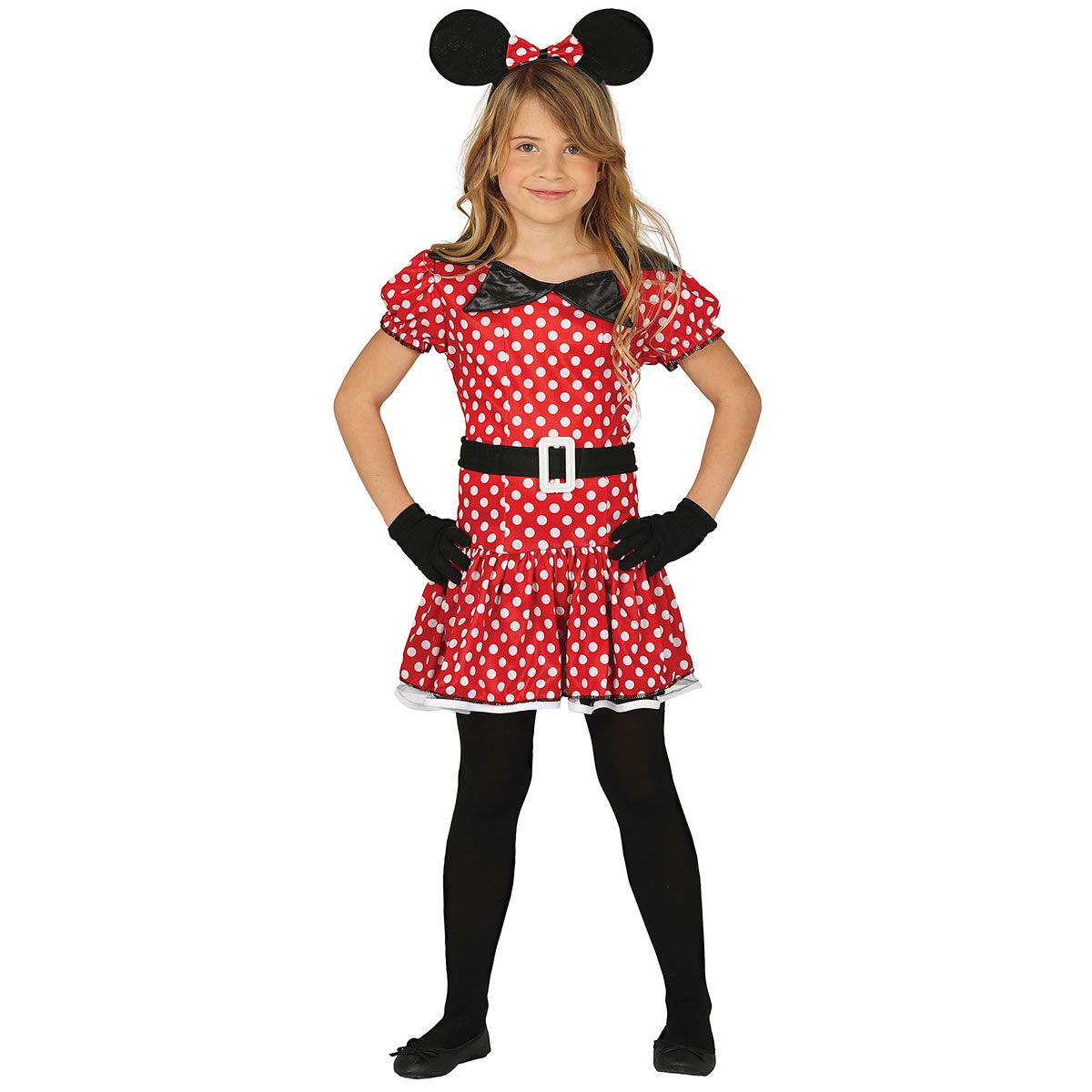 Mimmi Pigg Maskeraddräkt Barn omfattar en barndräkt med ett svart diadem med svarta öron och en röd fluga med vita prickar, en röd klänning med vita prickar och ett fastsytt svart midjeband med ett vitt spänne.