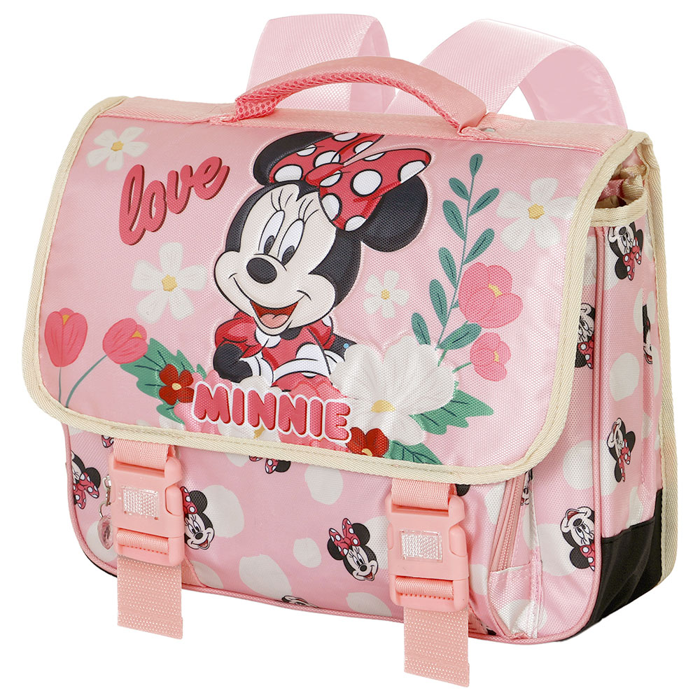 Mimmi Pigg Skolväska Trädgård omfattar en rosa skolväska med Mimmi Pigg motiv. Väskan stängs med spännen och har ett bärhandtag, justerbara vadderade axelband, två huvudfack, ett framfack med dragkedja och ett fack på baksidan.