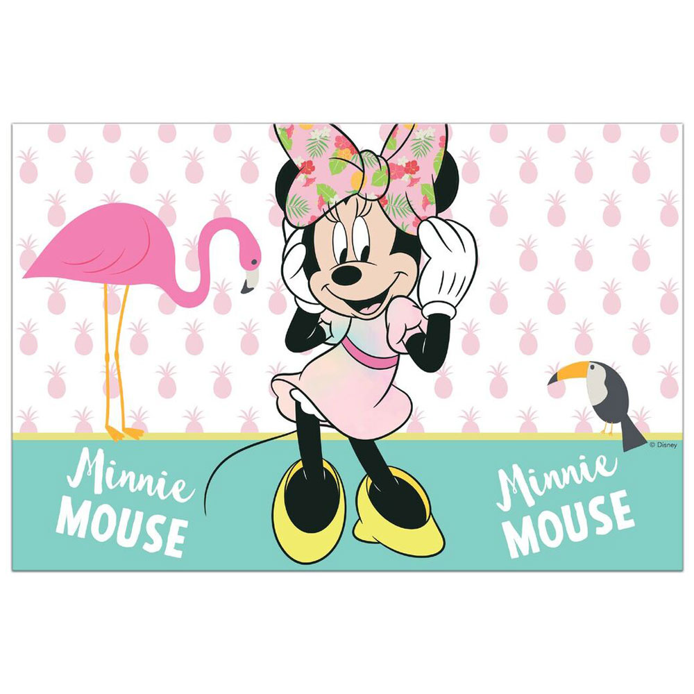 Mimmi Pigg Tropical Bordsduk är en tjusig bordsduk i vitt med motiv av rosa ananaser, flamingos, fåglar och Mimmi Pigg. Dukens kanter är i en snygg blå-grön nyans med texten "Minnie Mouse". Duken är tillverkad i plast.