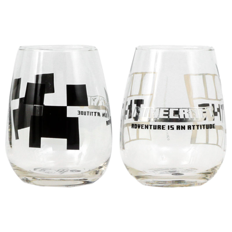 Minecraft Glas 2-pack omfattar två transparenta glas med rundad form och avsmalnad topp med svart- och silverfärgat Minecraft motiv och texten "Minecraft – Adventure is an attitude". Glasen rymmer 510 ml och bör diskas för hand.