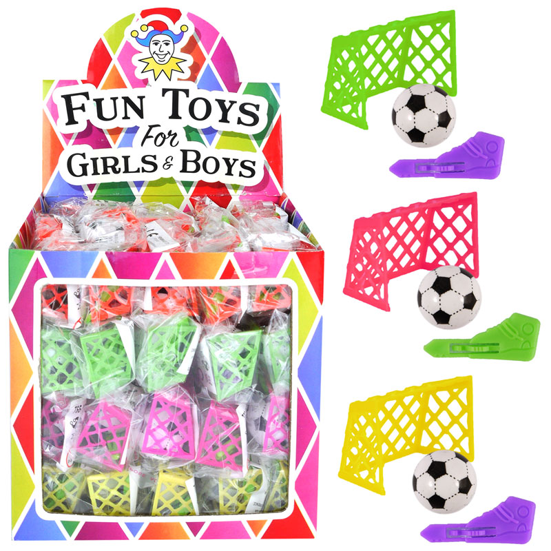 Mini Fotbollsspel med Mål innefattar ett miniatyr spel med en liten fotboll, ett litet mål och en sko som går att sätta in i fotbollen och skjuta iväg.