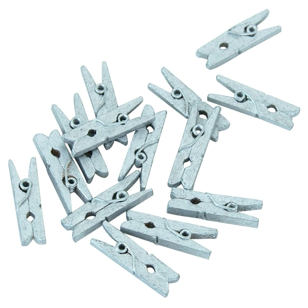 Mini Klädnypor Silver omfattar ett 24-pack silvriga mini klädnypor av trä som är ca 2,5 cm långa.