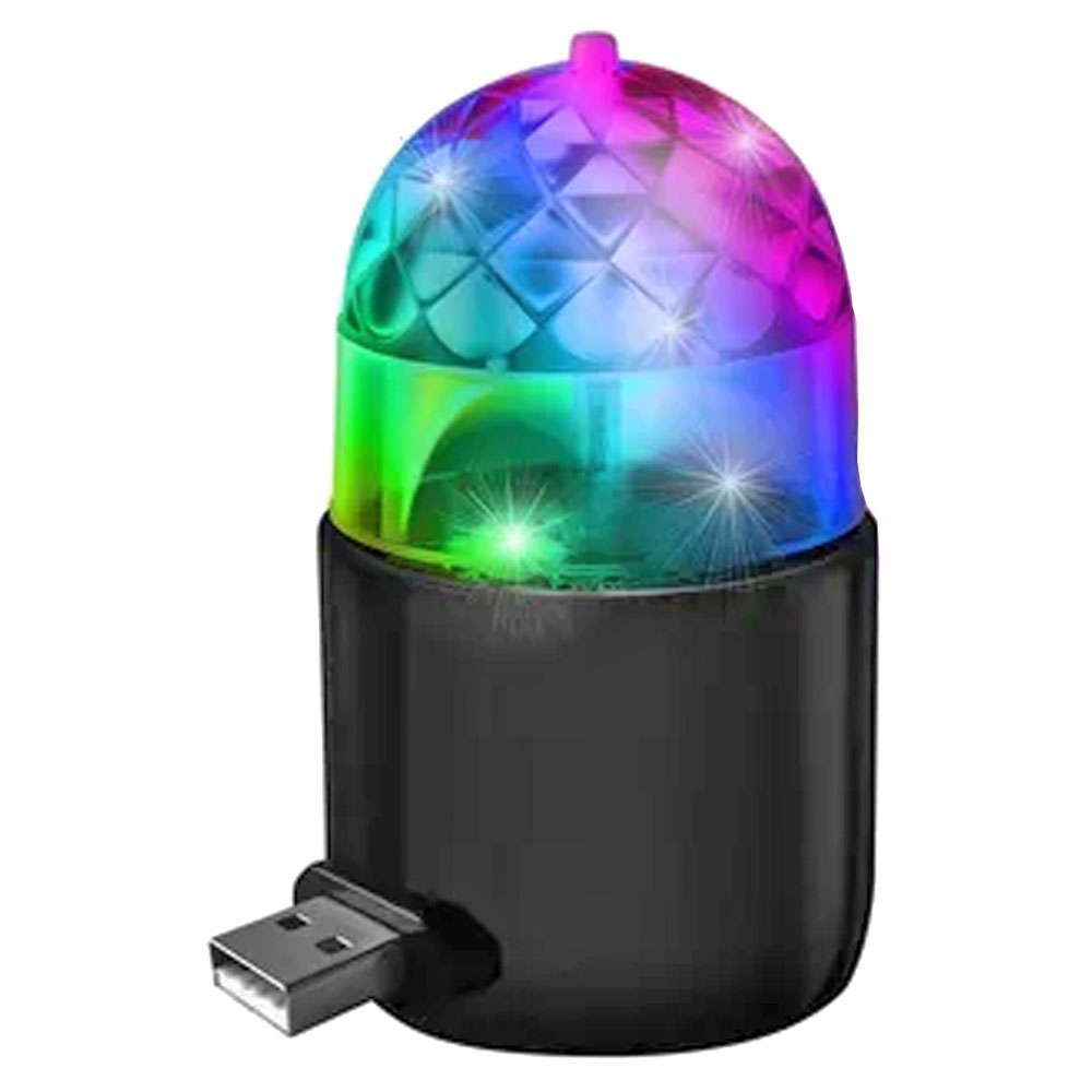 Stående Discolampa LED Mini omfattar en liten stående discolampa med svart botten och LED belysning. Lampan har två olika lägen, stillastående med vitt ljus eller roterande med blått, rött och grönt ljus. Discolampan kopplas i med USB-sladd och är ca 10 cm hög och 5 cm diameter. Tillverkad i plast.