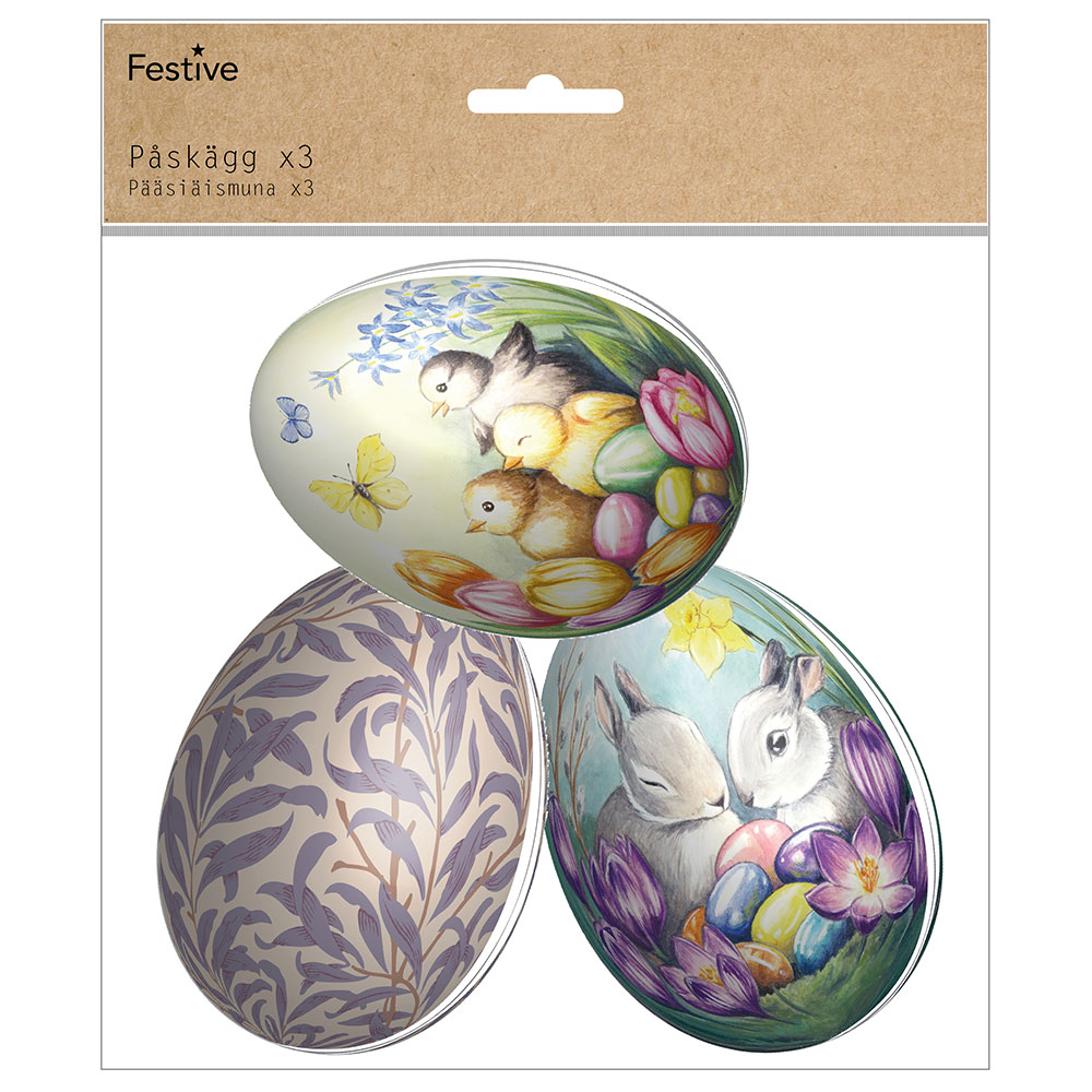 Mini Påskägg 9 cm omfattar tre st minipåskägg av papp. Äggen är ca 9 cm stora och pryds av olika motiv.
