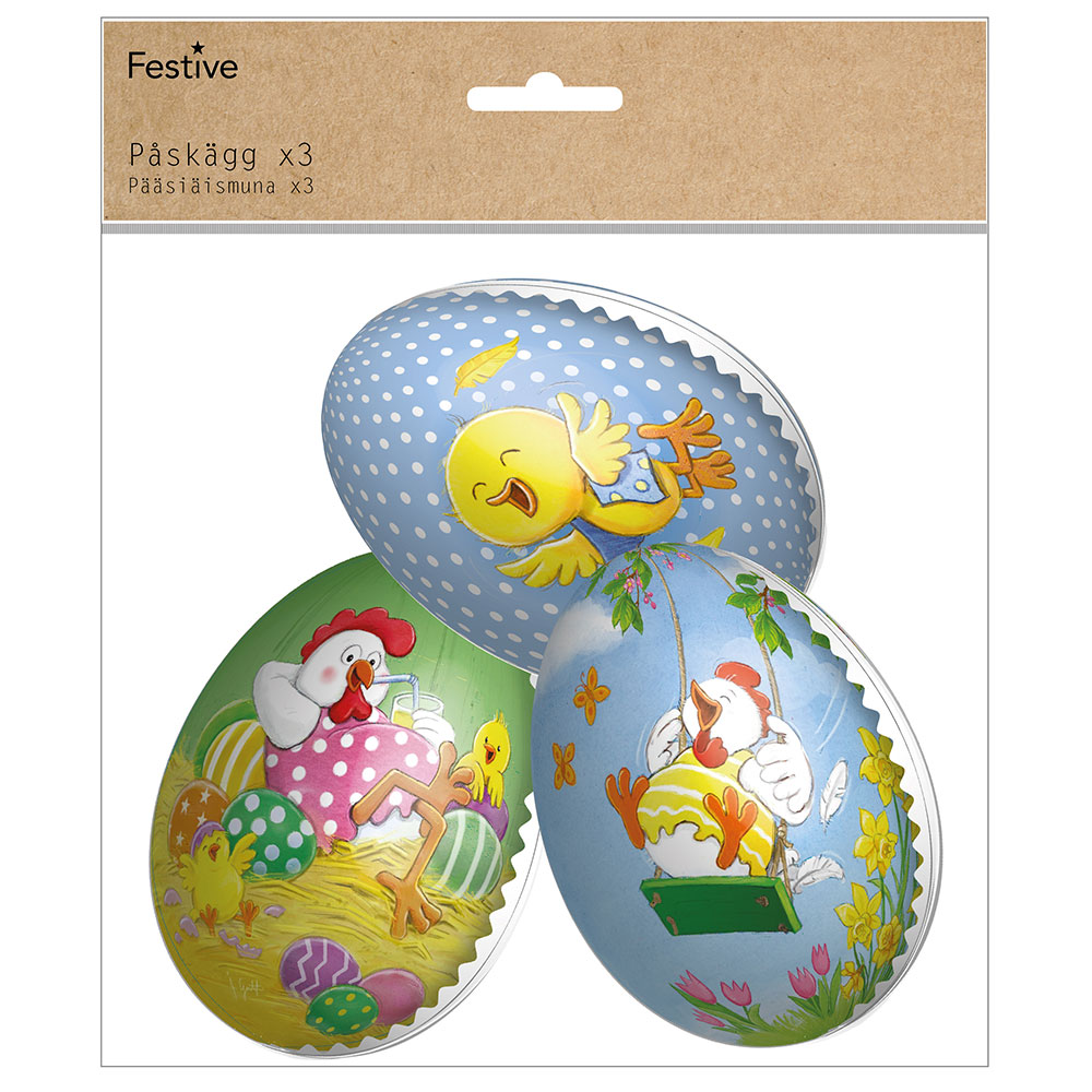 Mini Påskägg Kycklingar 9 cm omfattar tre stycken minipåskägg som är ca 9 cm stora. Äggen är i papp och pryds av olika motiv av påskkycklingar.