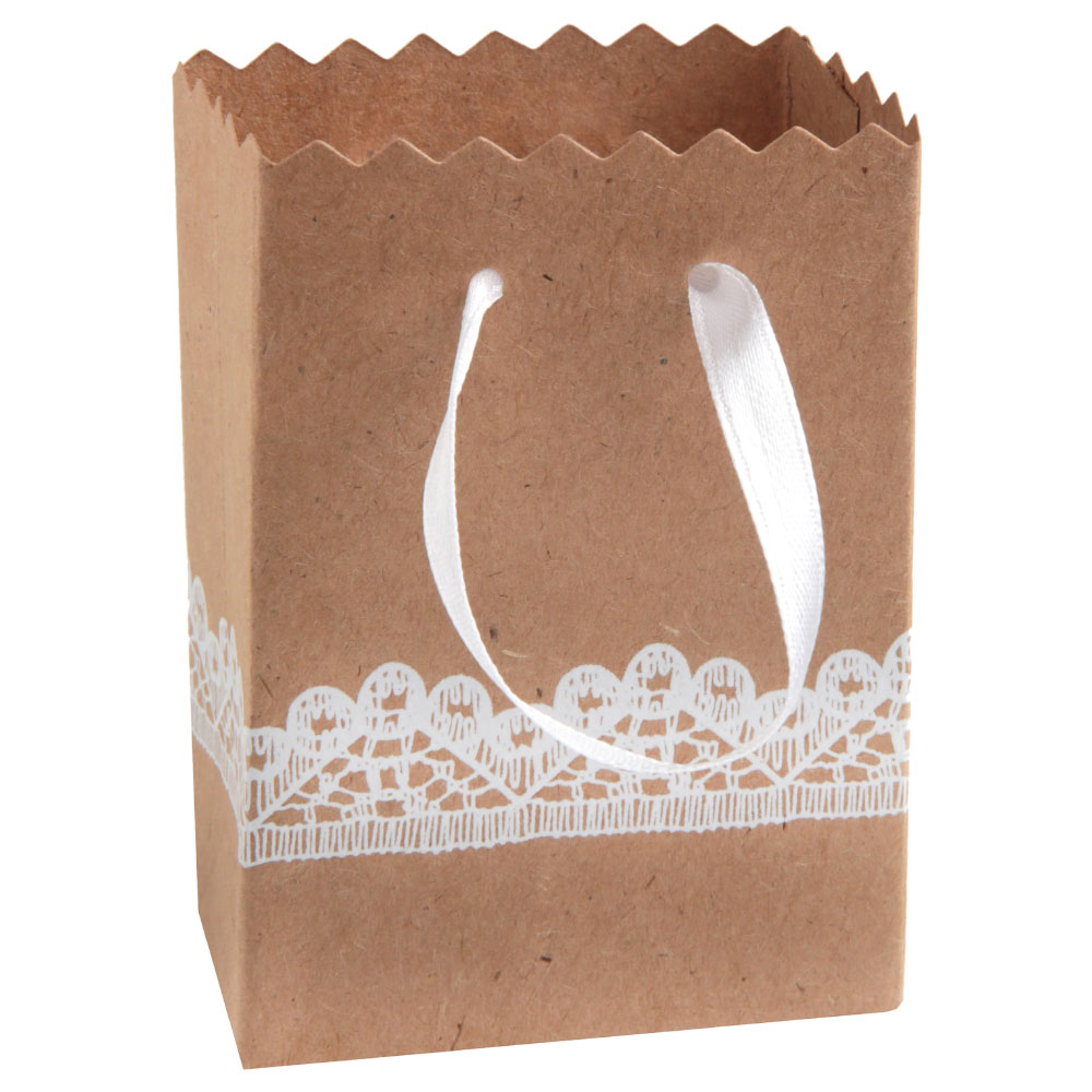 Mini Presentpåsar Spets omfattar 6 stycken bruna minipresentpåsar med vitt spetsmotiv samt vita handtag. Påsarna är tillverkade av papp och är ca 9 cm höga, 6 cm breda samt 3,5 cm djupa.