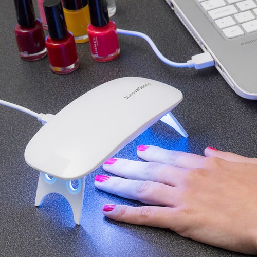 Koppla in UV-lampan i ett USB-uttag, ställ timern på 45 eller 60 sekunders-läge och placera dina nymålade naglar under lampan.