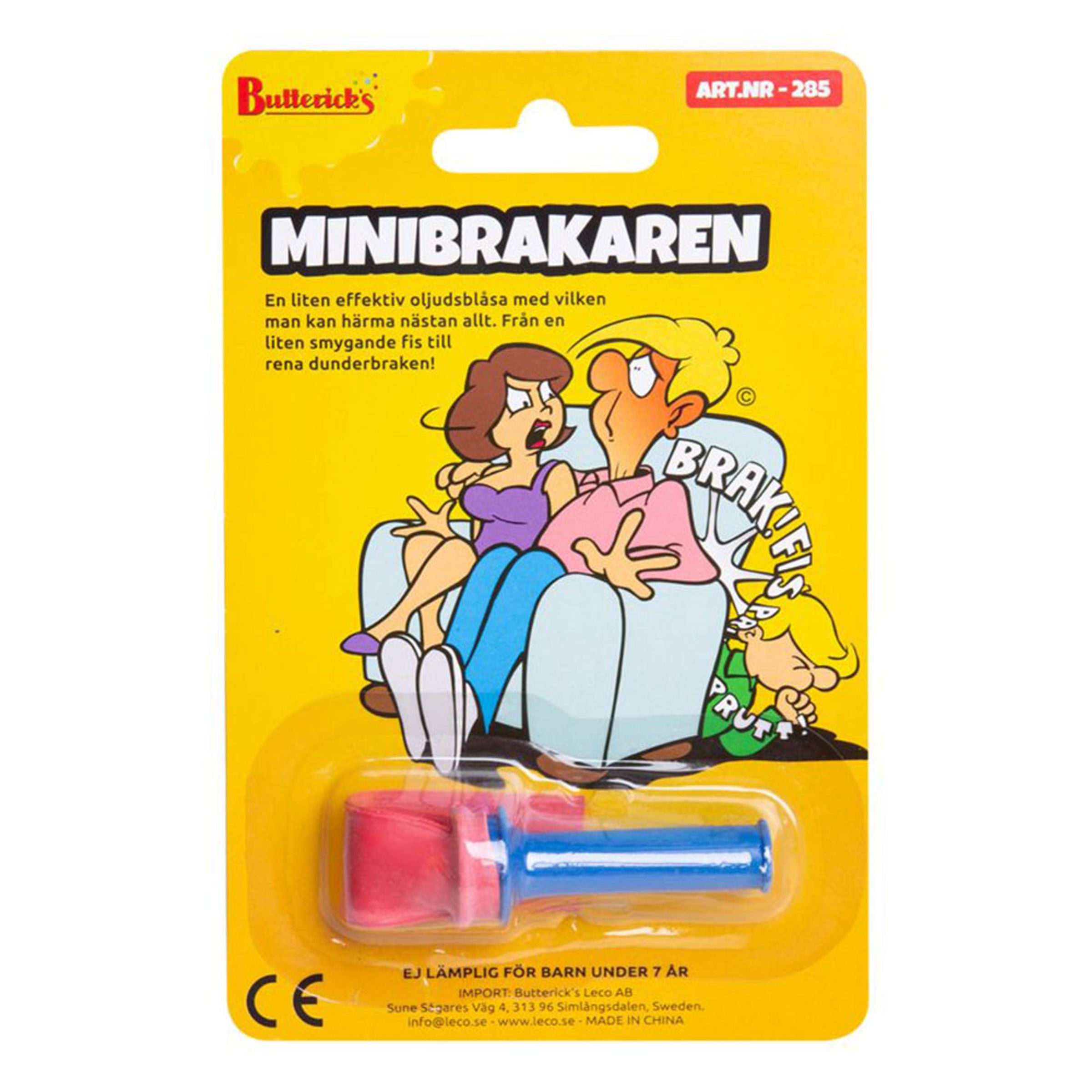 Minibrakaren är en klassisk skärmartikel att använda när du villl ha en pruttkudde med dig var du än är. Den lilla storleken gör att du lätt kan ha den i fickan och plocka fram den när den behövs som mest: I aulan, i skolan eller under läxförhören. Tryck bara på gummit för att släppa loss pruttljud!