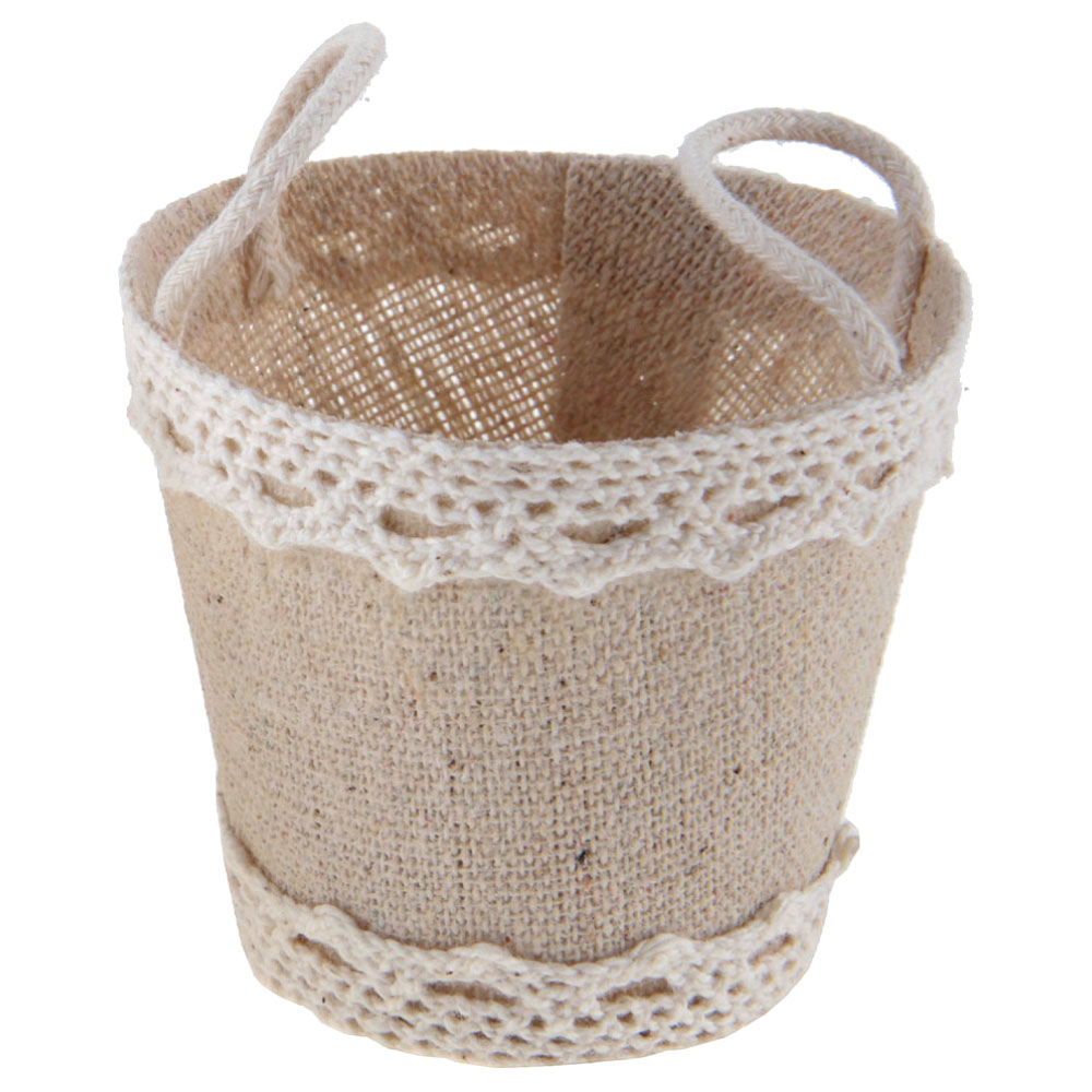 Minikorgar med Spets Beige omfattar 4 stycken små minikorgar i beige med dekorativ spets och små handtag. Korgarna är tillverkade av polyester och bomull och är ca 6,5 cm stora.