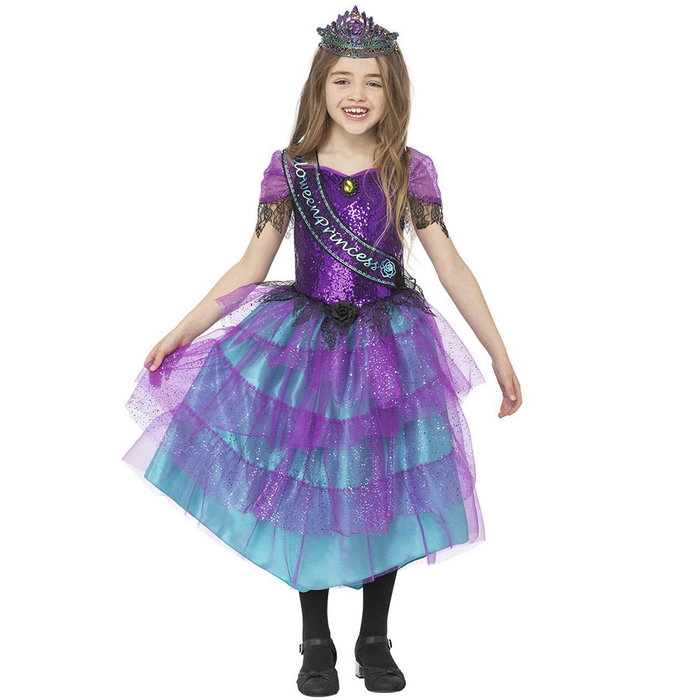 Miss Halloween Klänning Barn omfattar en lila och turkos klänning med en topp fylld av lila paljetter på framsidan, lila och svarta axlar i nättyg, en svart sash med texten "Halloween Princess", kjol täckt i glittrigt nättyg och ett diadem med en tiara.