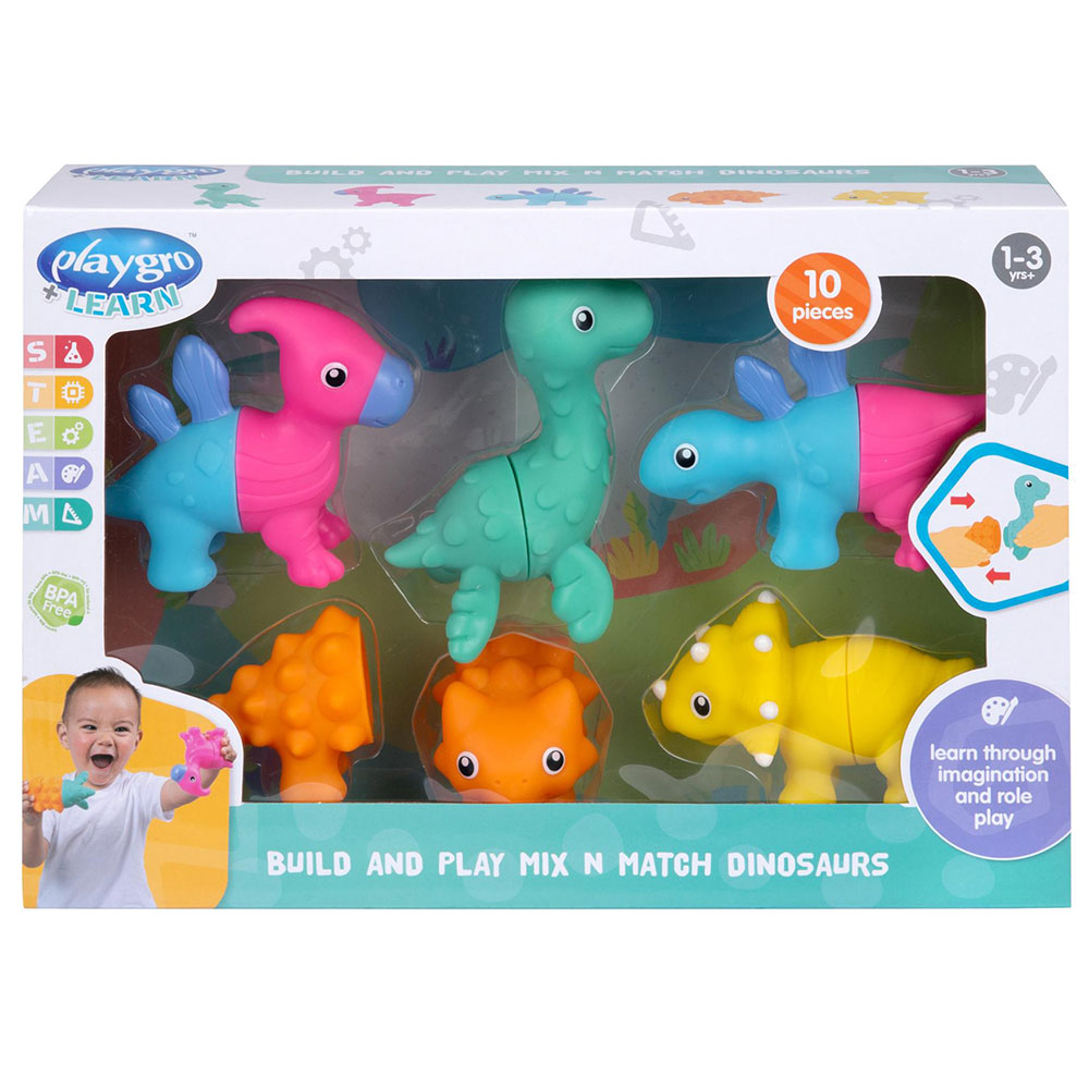 Mix & Match Dinosaurier innehåller tio halva dinosauriefigurer tillverkade av plast med dinosauriemotiv i färgerna orange, gul, grön, blå och rosa. Varje figur är delad i en framsida och en baksida som kan sättas ihop för att skapa olika dinosauriekombinationer. Dessa figurer är lämpliga för barn i åldrarna ett till tre år och kan också användas i badet. Denna leksak främjar lek och lärande inom vetenskap, teknik, konst och matematik.