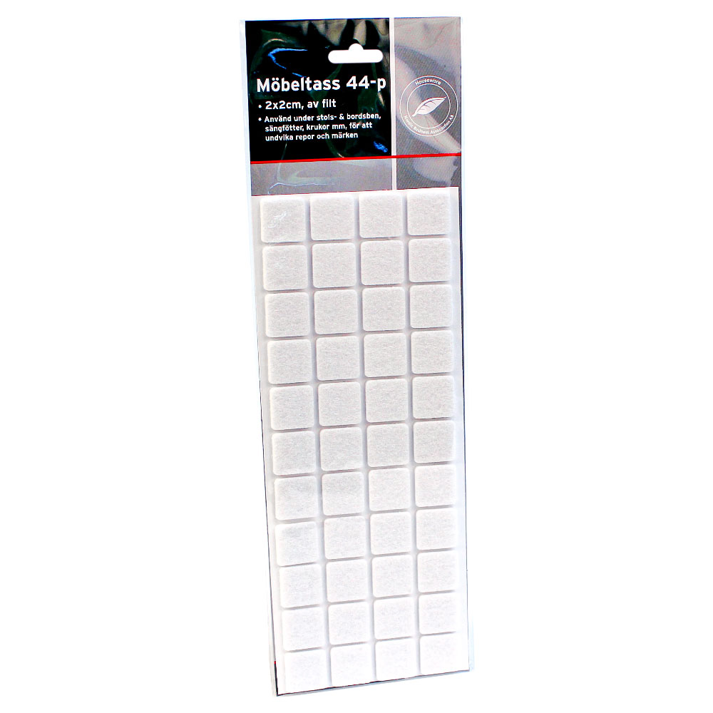 Möbeltassar Fyrkantiga 20 mm består av vita filttassar som är självhäftande. De mäter ungefär 2 cm. Tillverkade av filt. Säljs i 44-pack.