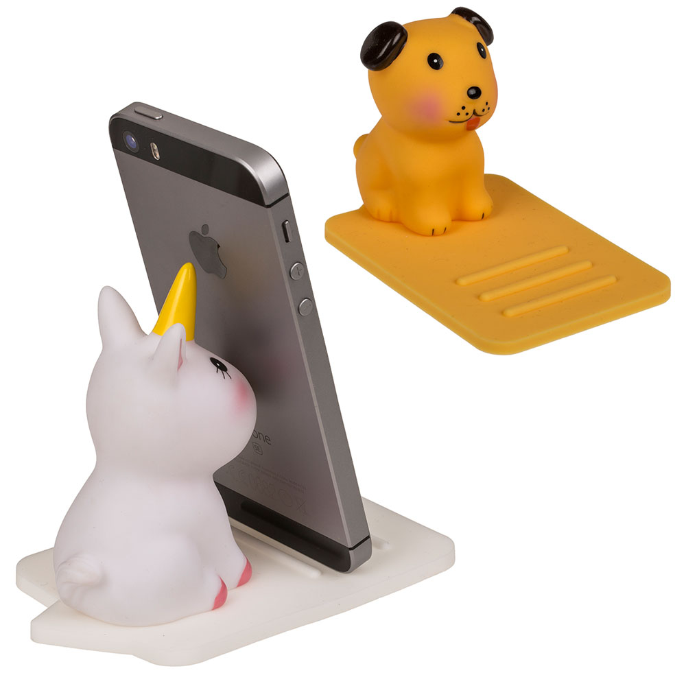 Mobilhållare Djur omfattar en mobilhållare med ett sött litet djur som stöder upp telefonen. Finns i gult med en hund eller vitt med en katt eller enhörning.