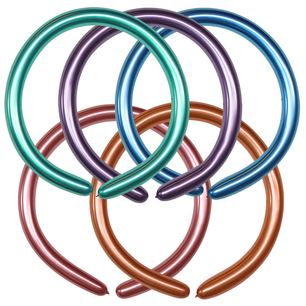 Modellballonger Chrome Olika Färger 100-pack omfattar 100 stycken modell-latexballonger i olika chrome-färger som kan vridas och formas till olika figurer. Ballongerna fylls med luft, mäter ca 5 cm i diameter och är ca 120 cm långa. Ballongerna är även biologiskt nedbrytbara.