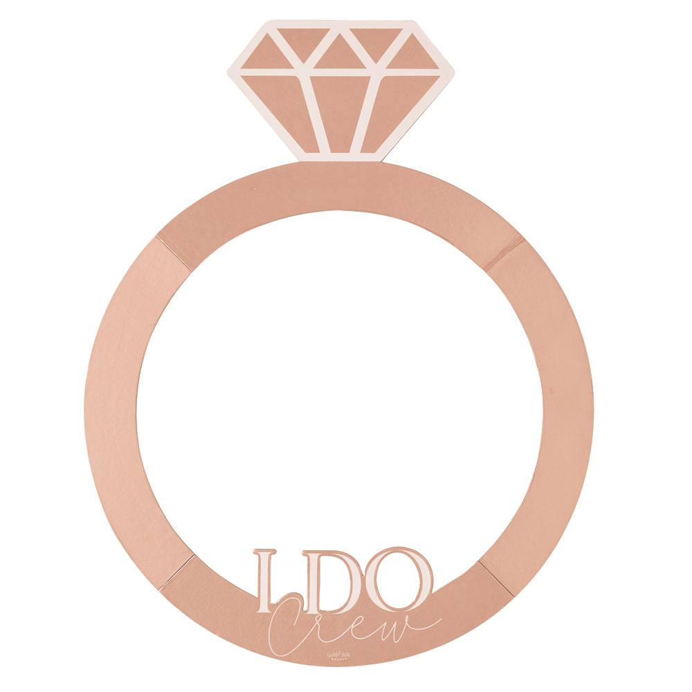 Möhippa Fotoram Diamantring innehåller en stor fotoram att hålla upp med händerna framför sig till fotografier. Fotoramen är i form av en stor diamantring i skimrande roséguld med detaljer och texten "I Do Crew" i pastell ljusrosa. Instruktioner för att sätta ihop ramen finns på förpackningen.