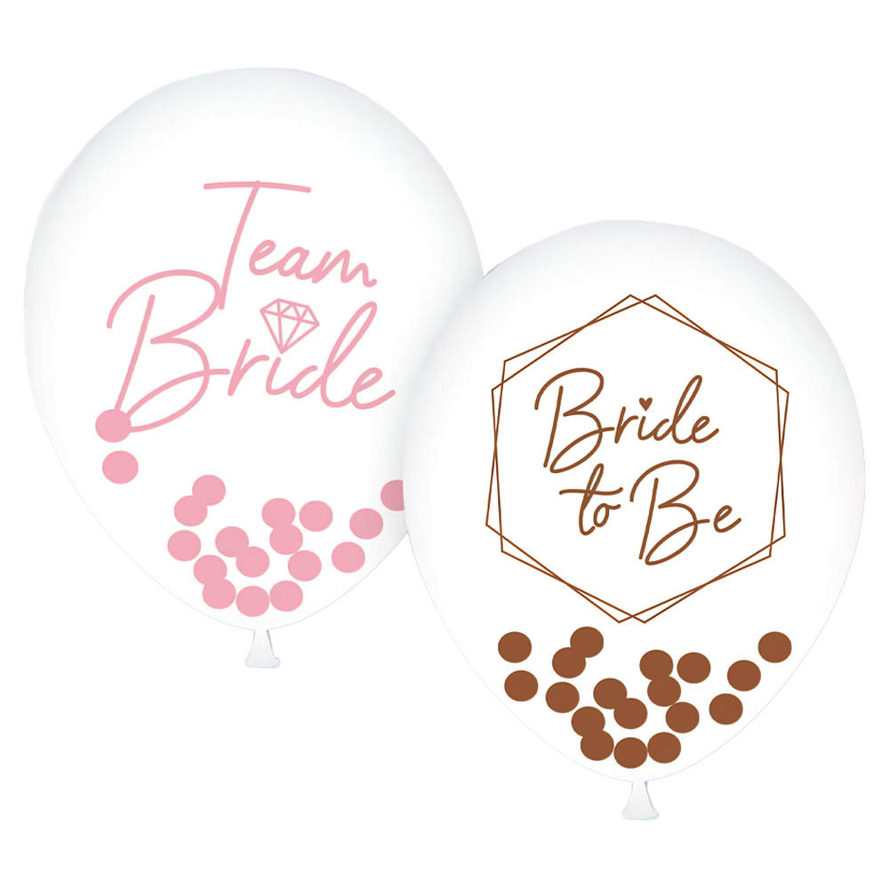Möhippa Konfettiballonger omfattar ett 6-pack genomskinliga latexballonger med "Bride To Be" och "Team Bride" texter i rosa och roséguld samt konfetti inuti. Ballongerna fylls med luft eller helium och blir ca 27 cm stora.