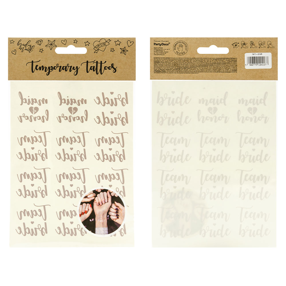 Gör bruden, brudtärnorna och alla vänner riktigt festfina inför möhippan med dessa temporära låtsas tatueringar! Snyggt guldiga gnuggis tatueringar i form av texterna "Bride", "Maid of Honor" och "Team Bride", vilket passar perfekt till hela möhippa-gänget. Riktigt fint och även roligt möhippa tillbehör som definitiv kommer att gillas!